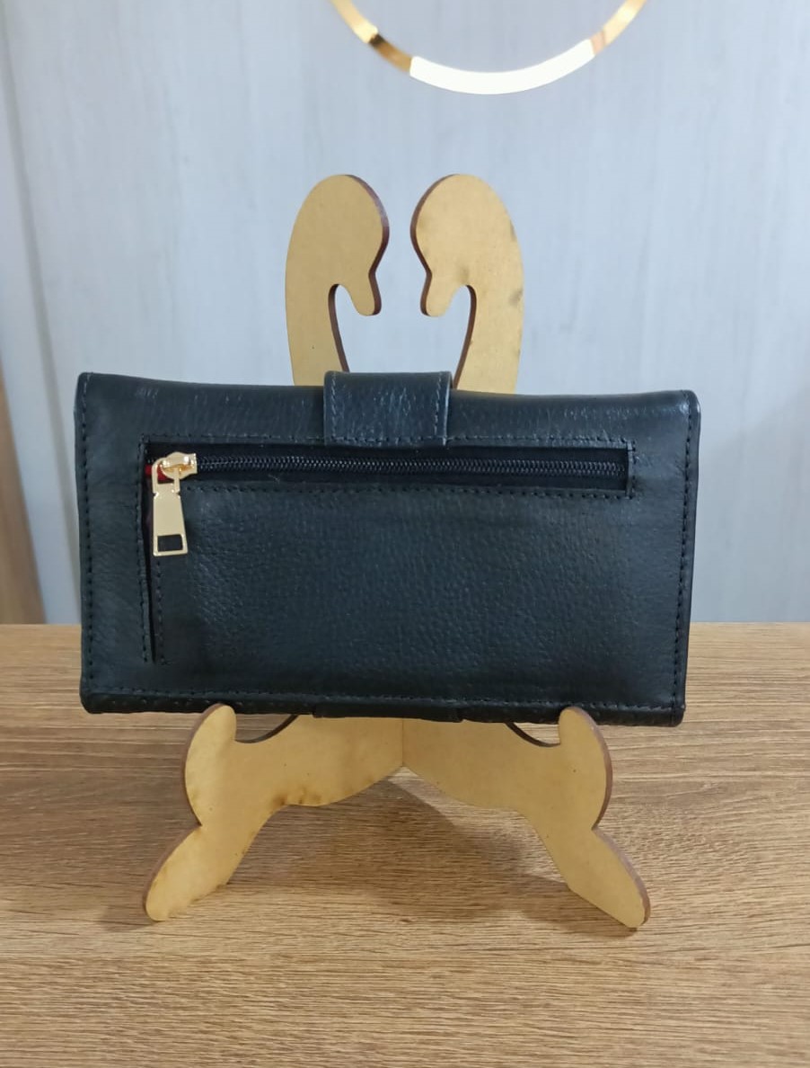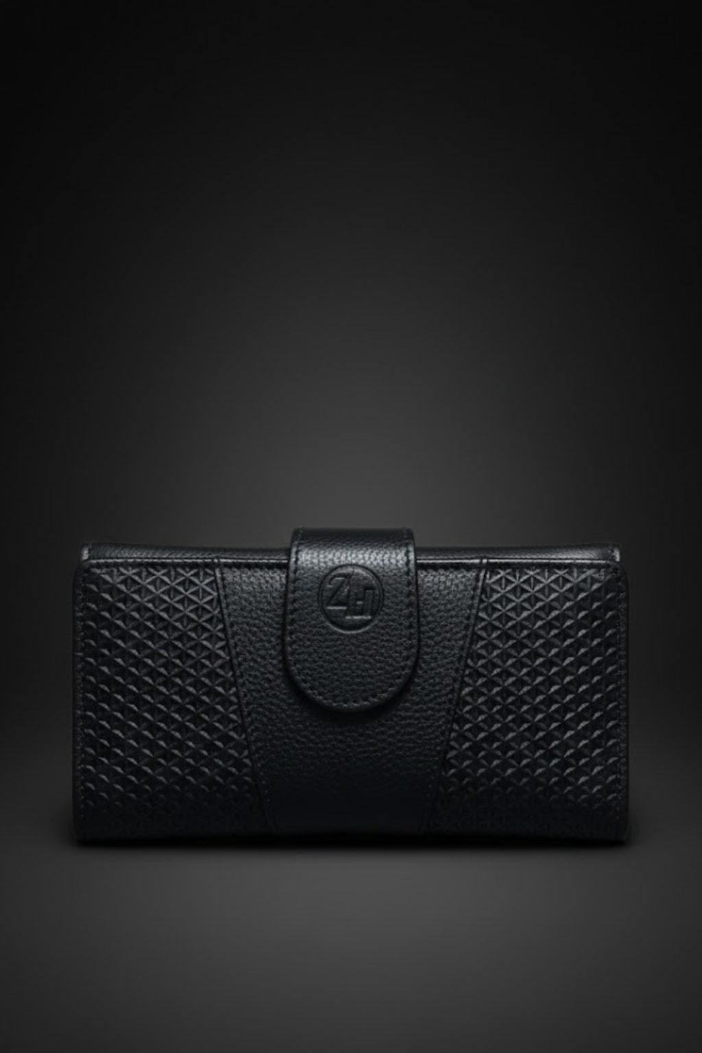 Billetera negra en cuero 100% legítimo, con textura geométrica grabada y broche frontal. Un clásico indispensable con alma artesanal.