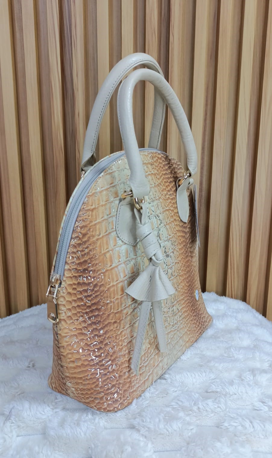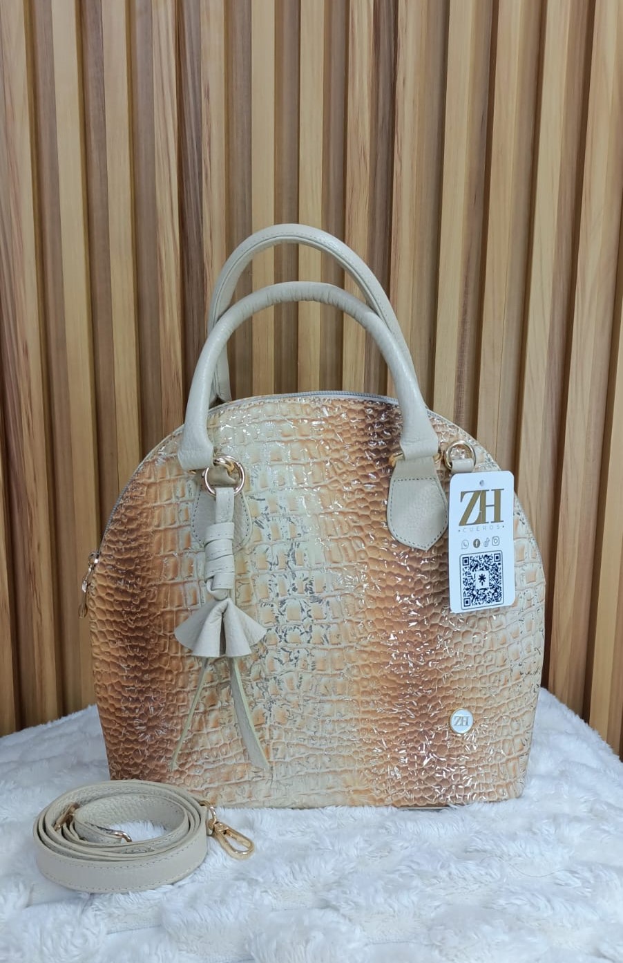 Este Bolso en tono arena es una oda a la sofisticación atemporal. Confeccionado 100% en cuero legítimo colombiano, presenta un elegante grabado tipo cocodrilo con efecto brillante y una transición de color beige a caramelo que recuerda la calidez de la tierra y la serenidad del desierto. Una pieza ideal para mujeres que prefieren lo clásico, con un toque moderno y sutil.