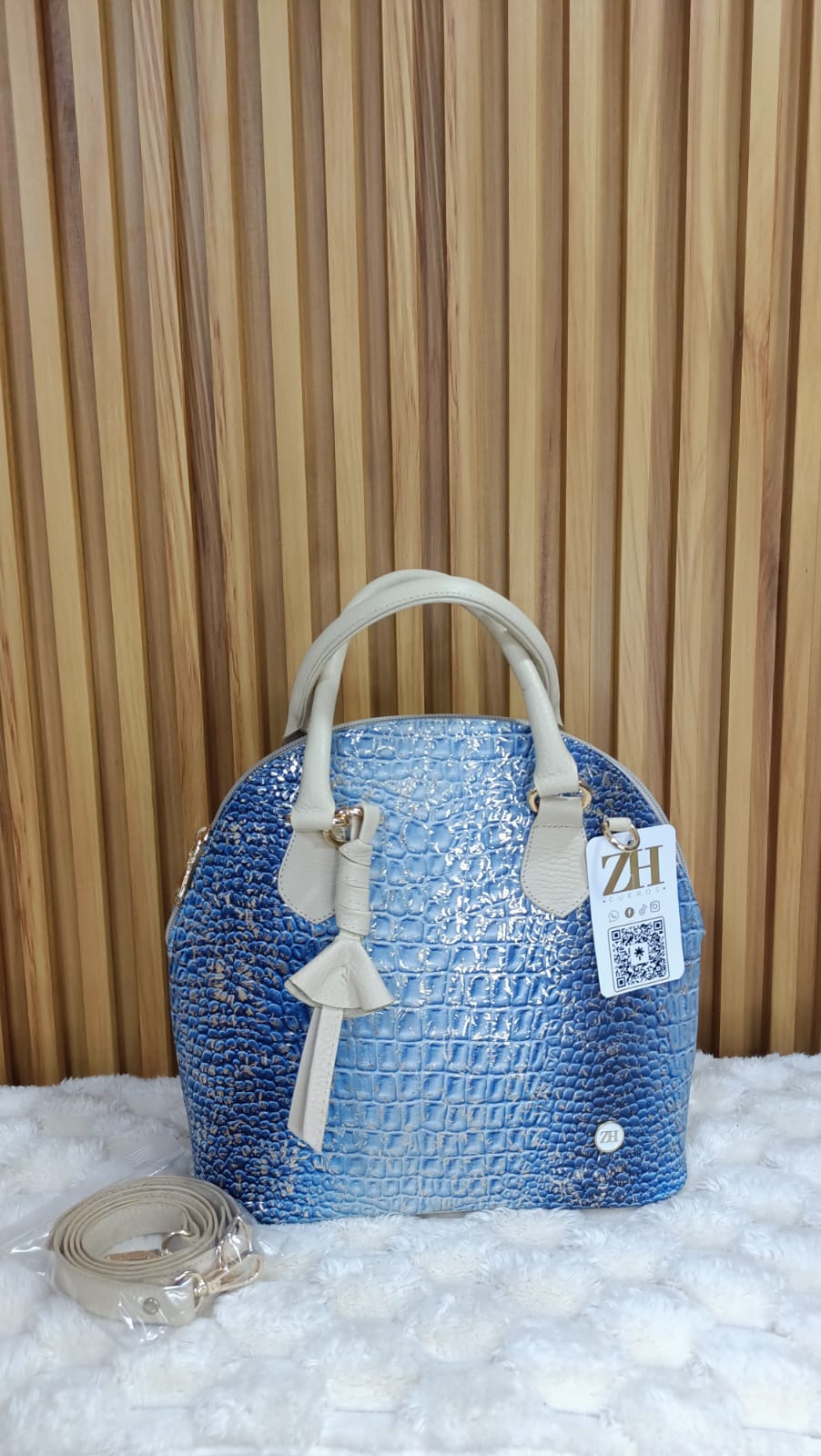 Inspirado en la delicadeza de una flor y la fuerza del cuero colombiano, el Bolso Daisy deslumbra con su degradado azul sobre textura cocodrilo, elaborado 100% en cuero legítimo. Sus asas y correa en tono beige neutro hacen contraste perfecto para un look fresco, elegante y atemporal.