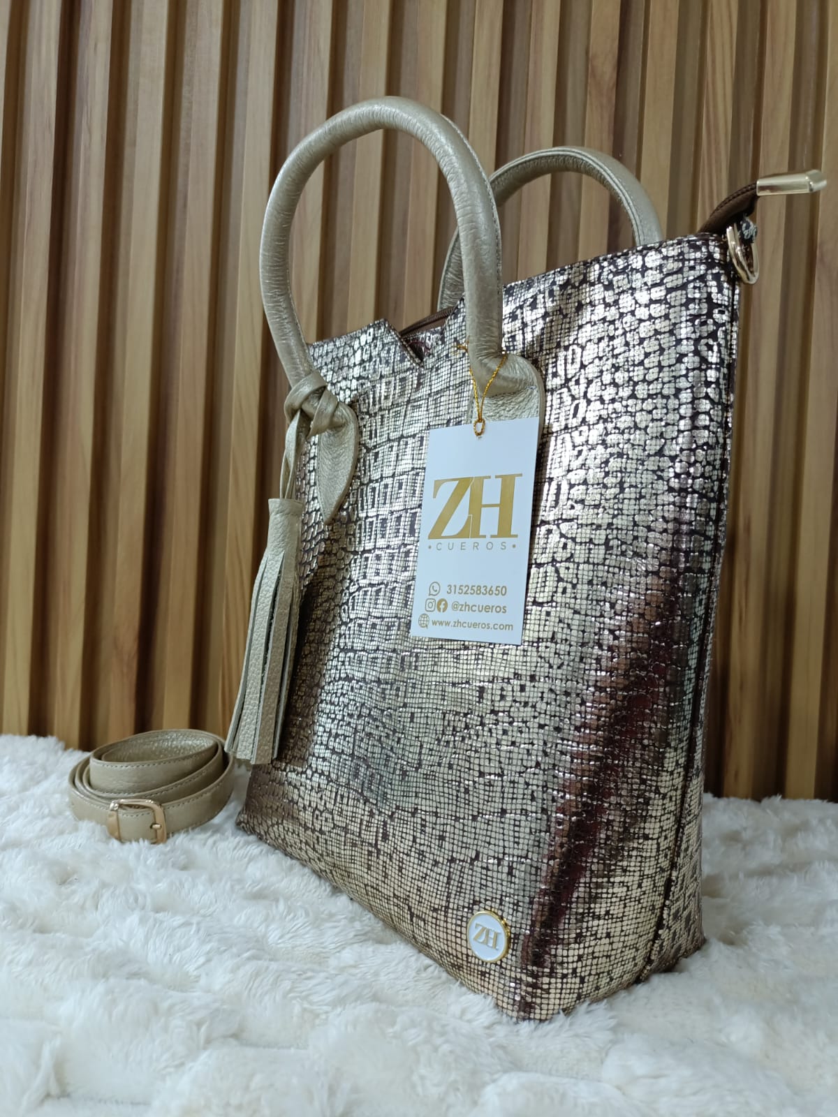 Un diseño moderno y brillante que combina elegancia y sofisticación. Su acabado metálico con textura de cuero lo convierte en el accesorio perfecto para destacar en cualquier ocasión.