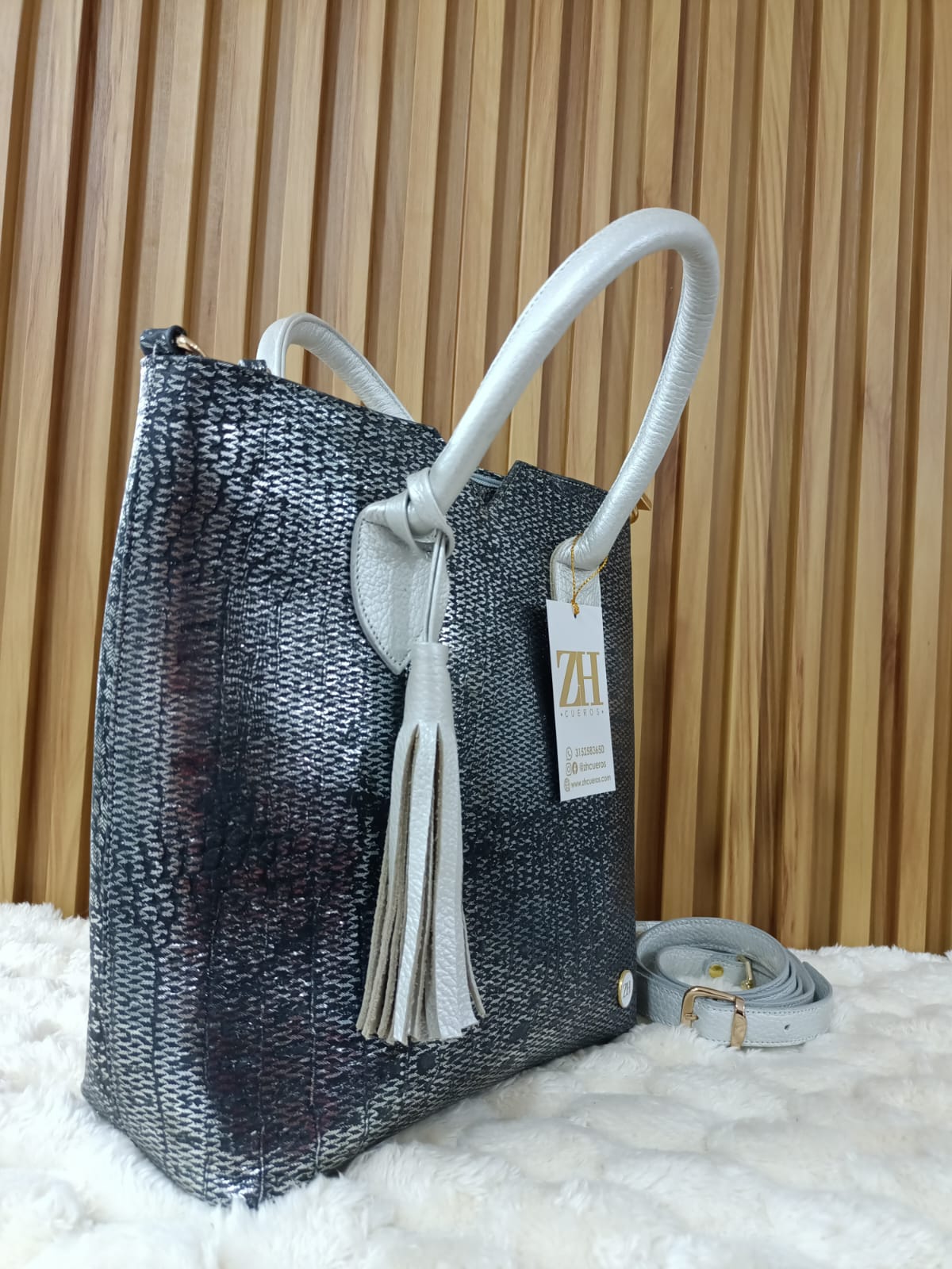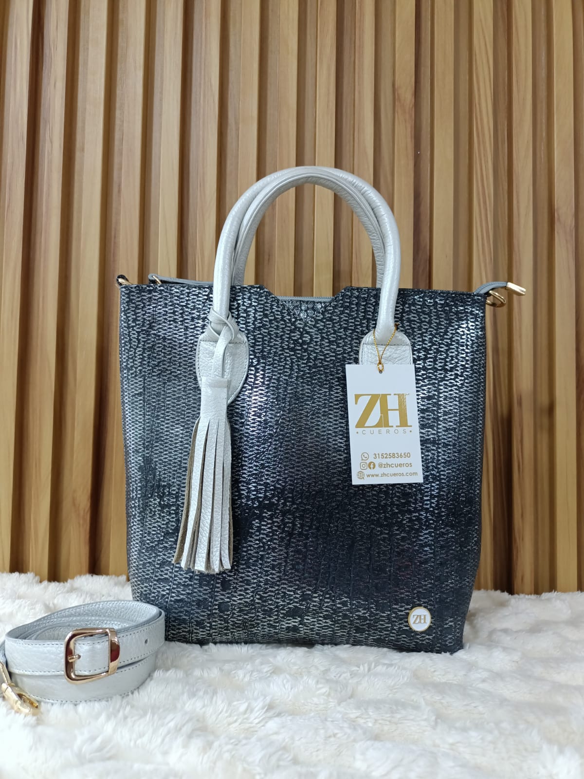 Una versión sofisticada con un toque metálico en tonos plata y negro. Incluye correa ajustable para mayor versatilidad, ideal para llevar con elegancia en cualquier ocasión.
