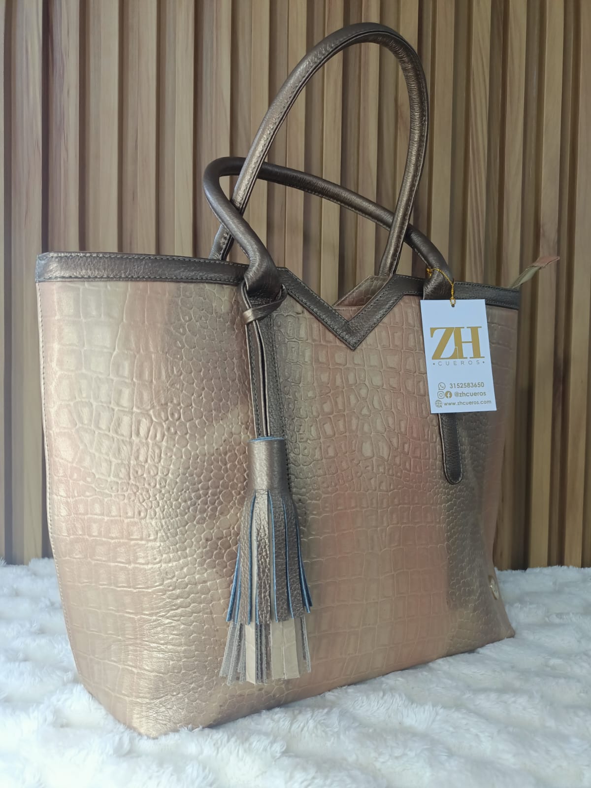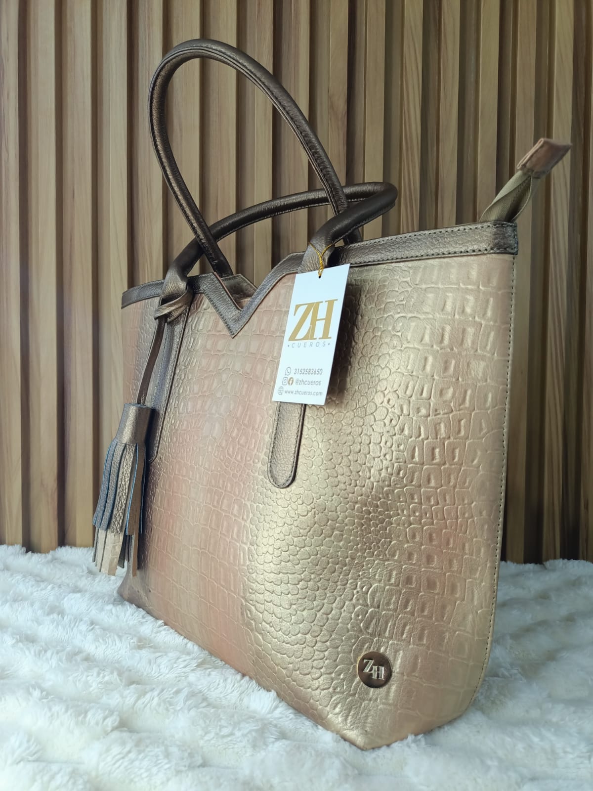 Un diseño exclusivo en tonalidades doradas con textura tipo croco, perfecto para quienes aman el estilo sofisticado y versátil.