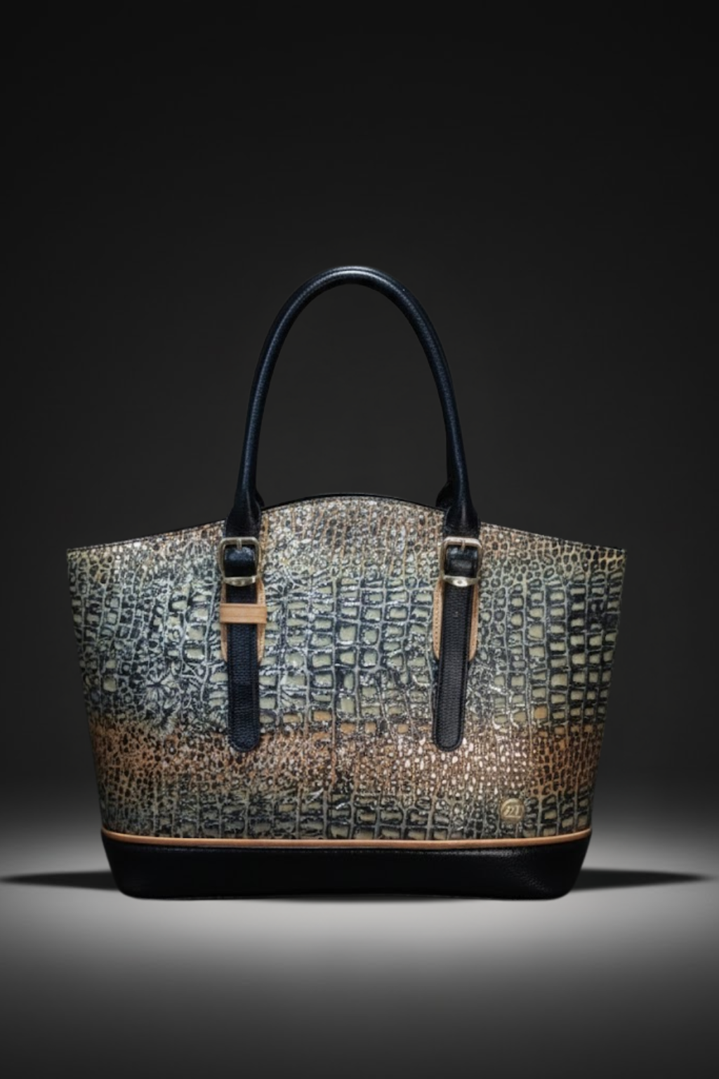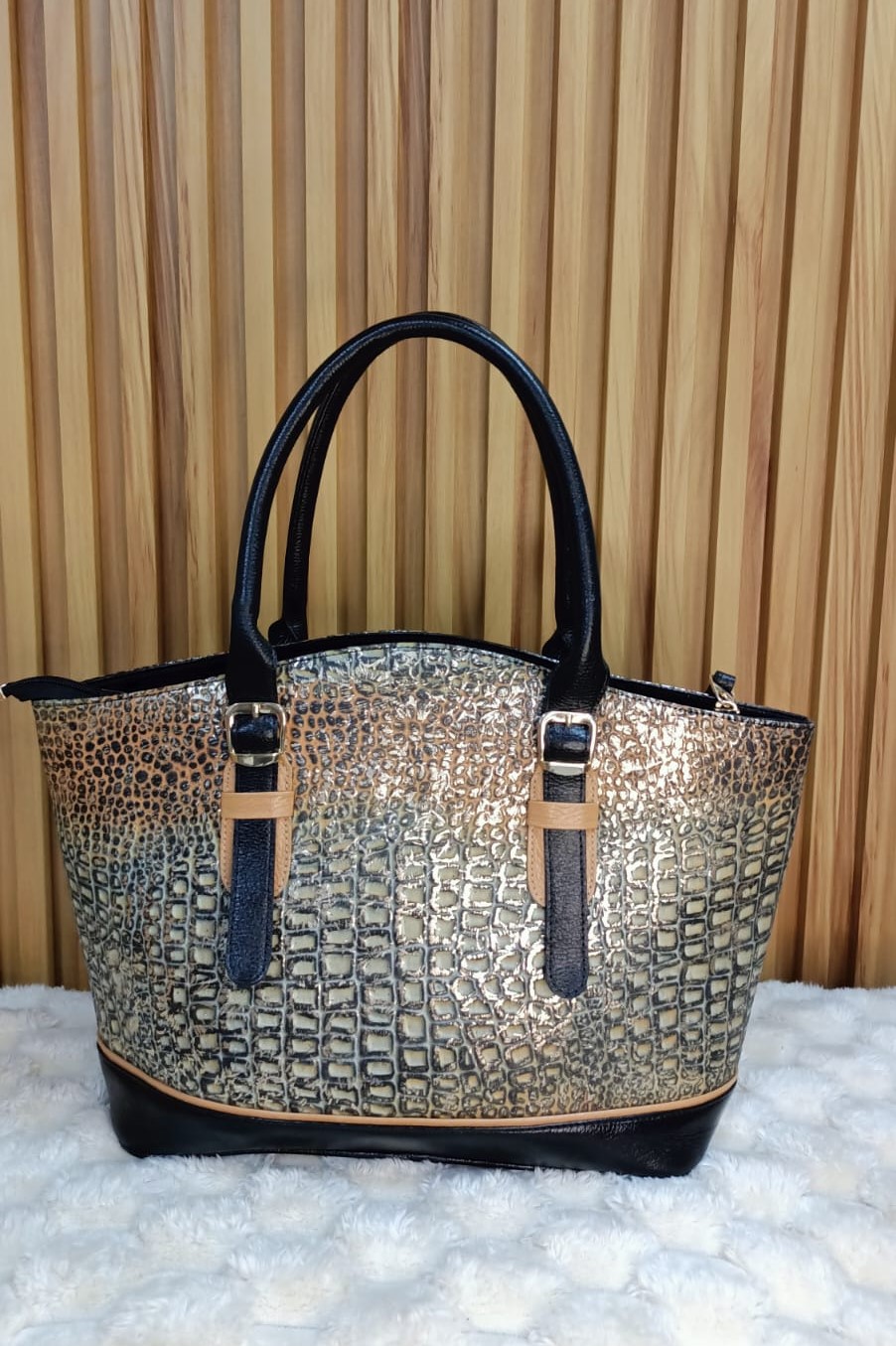 Diseñado para mujeres que pisan firme, este bolso combina cuero legítimo con textura tipo cocodrilo en tonos dorados y tierra, asas negras robustas y detalles tipo cinturón que realzan su estilo estructurado. Un clásico que nunca pasa de moda.