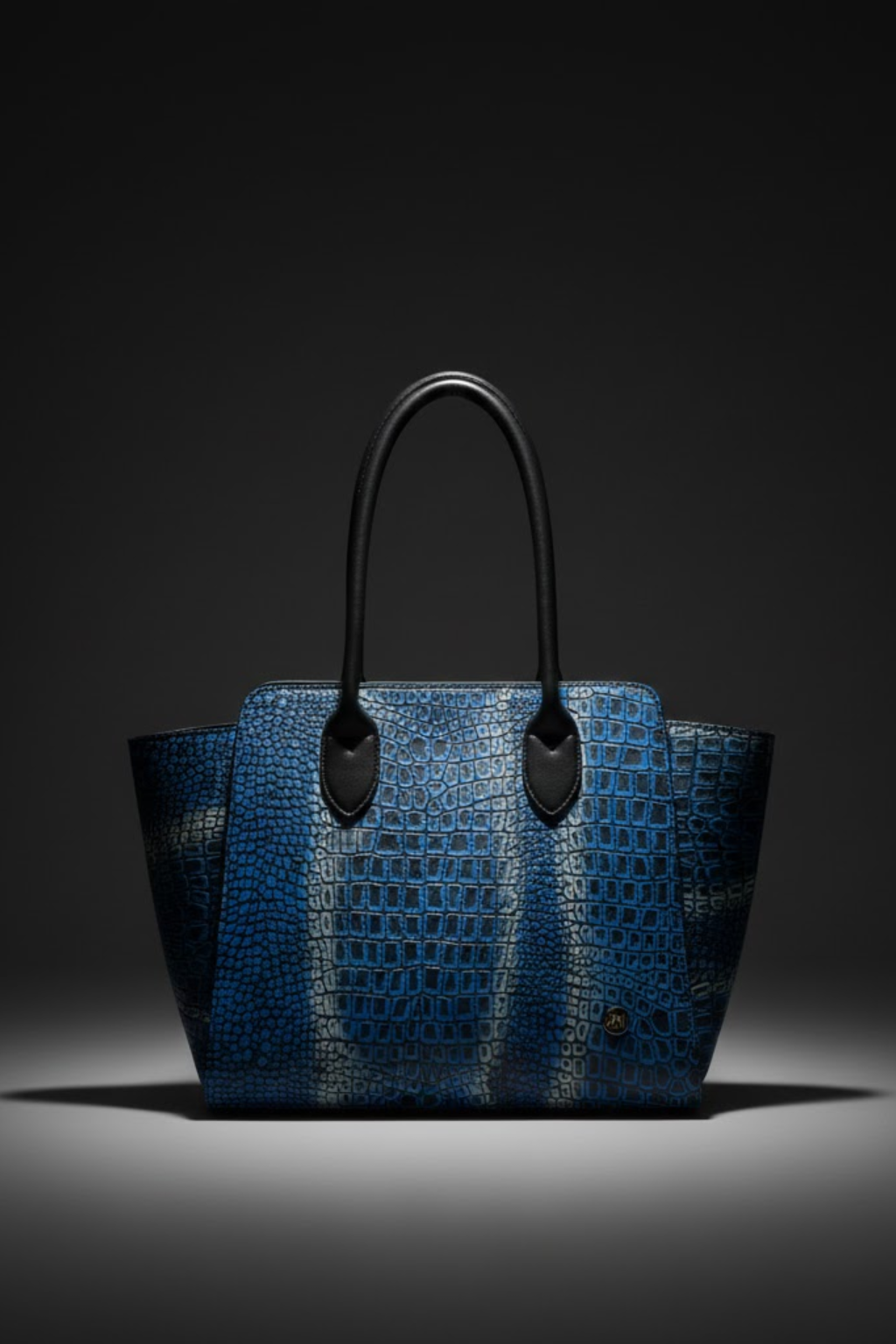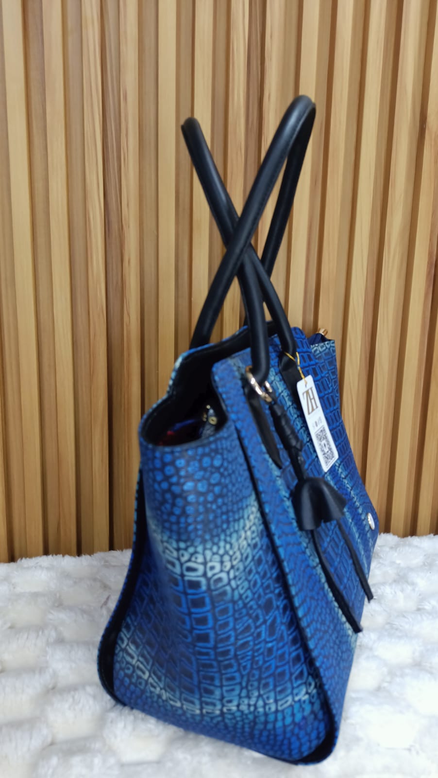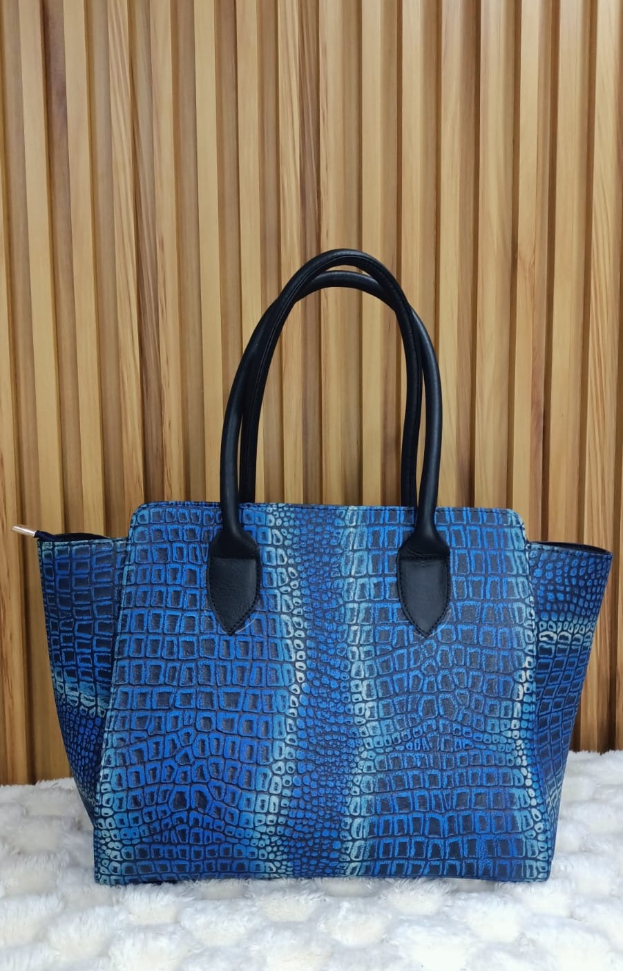 Combina cuero legítimo con textura tipo cocodrilo y un degradado azul profundo que transmite carácter y modernidad. Sus asas negras y detalles refinados lo convierten en una pieza sofisticada y funcional.