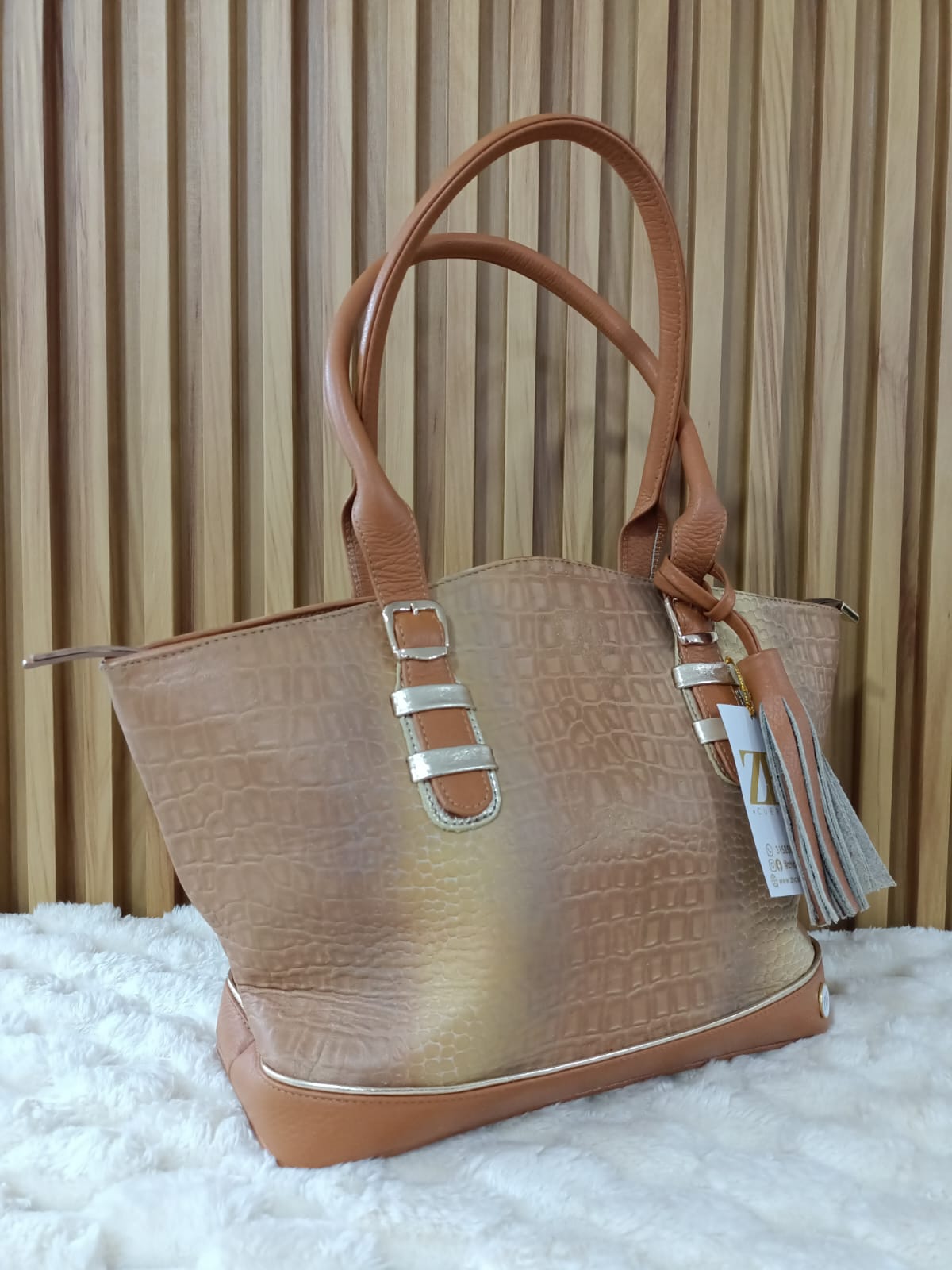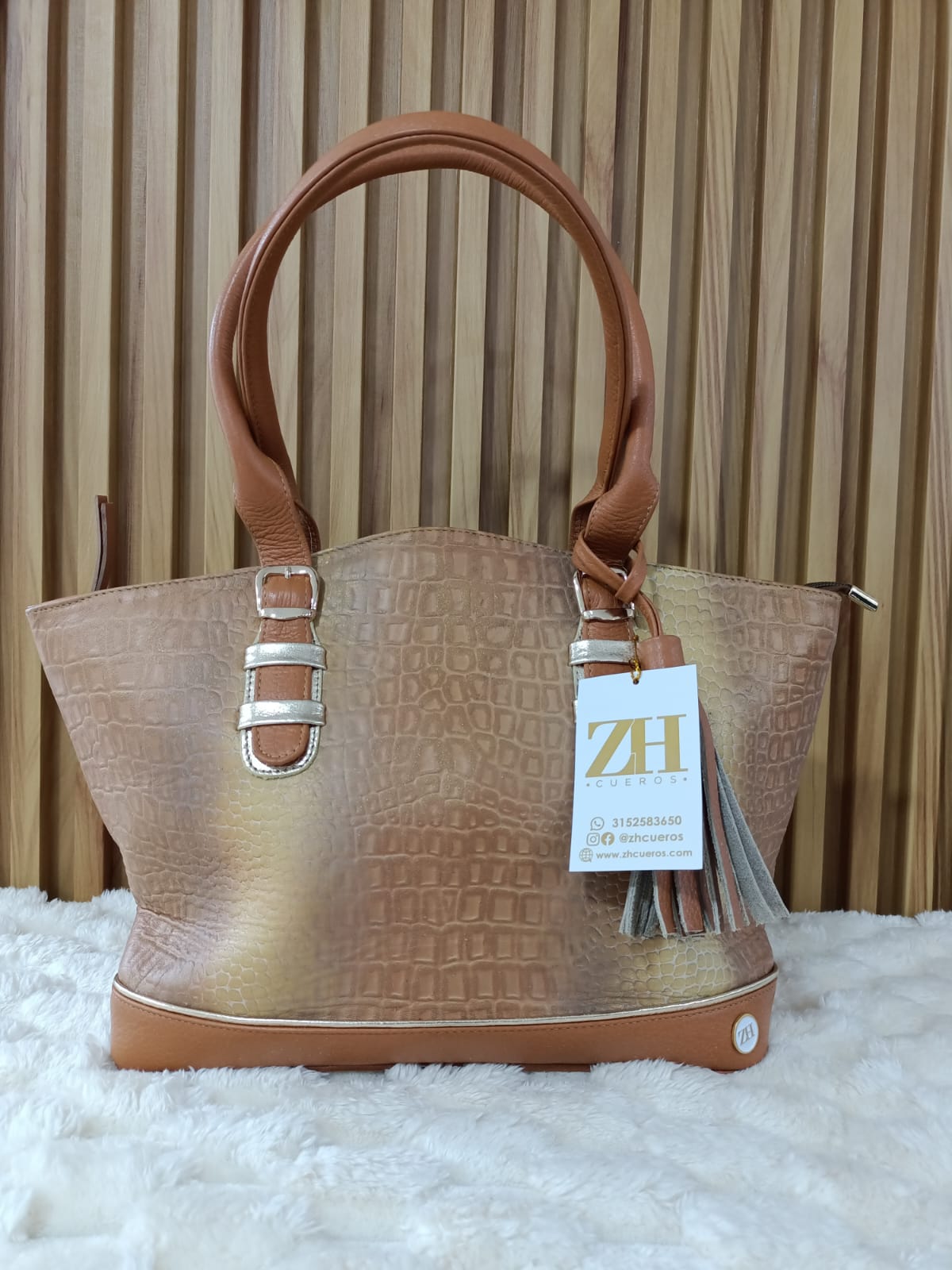 Una pieza sofisticada en tonos tierra con detalles metálicos que resaltan su diseño exclusivo. Perfecto para quienes buscan elegancia y estilo en un accesorio versátil.