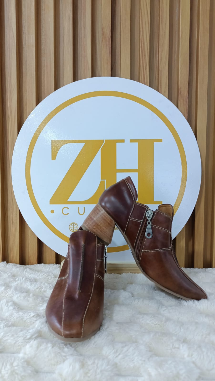 Estilo rústico y elegante con costuras a la vista y tacón robusto.