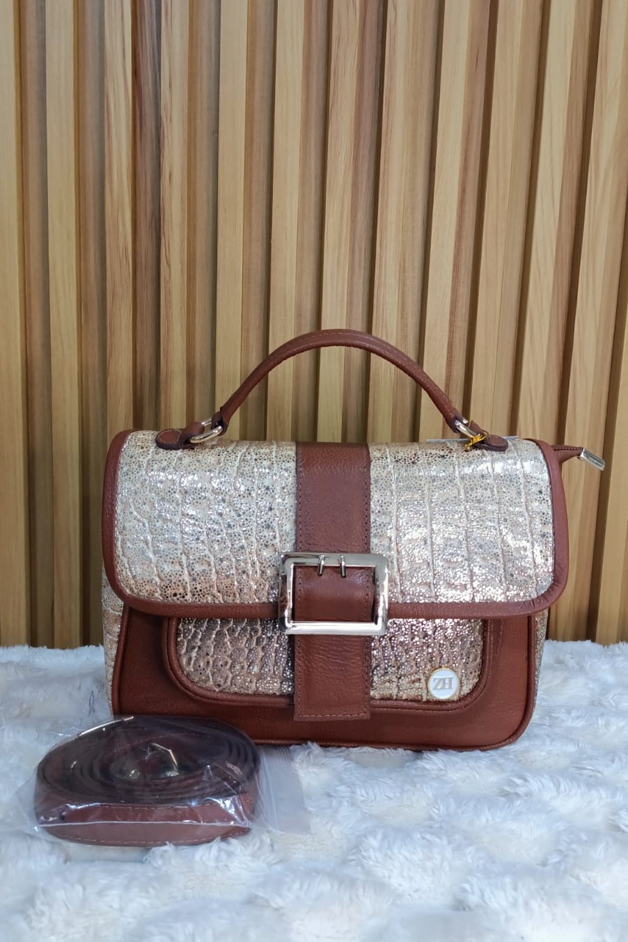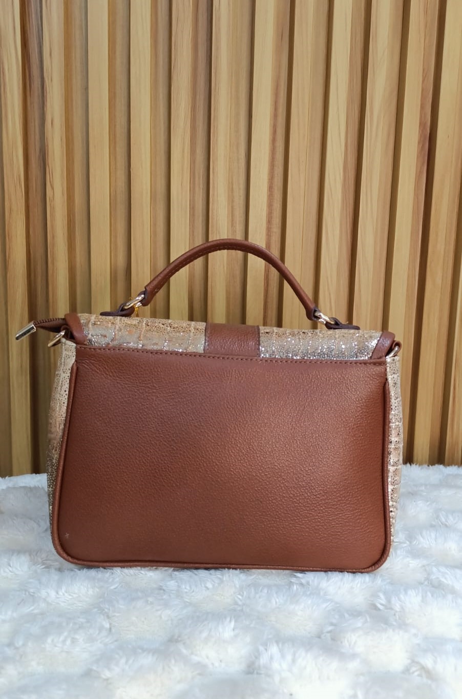 Cartera Atenea en cuero genuino con textura reptil y acabado metalizado dorado. Un diseño sofisticado y estructurado, ideal para mujeres que buscan elegancia y estilo en su día a día.