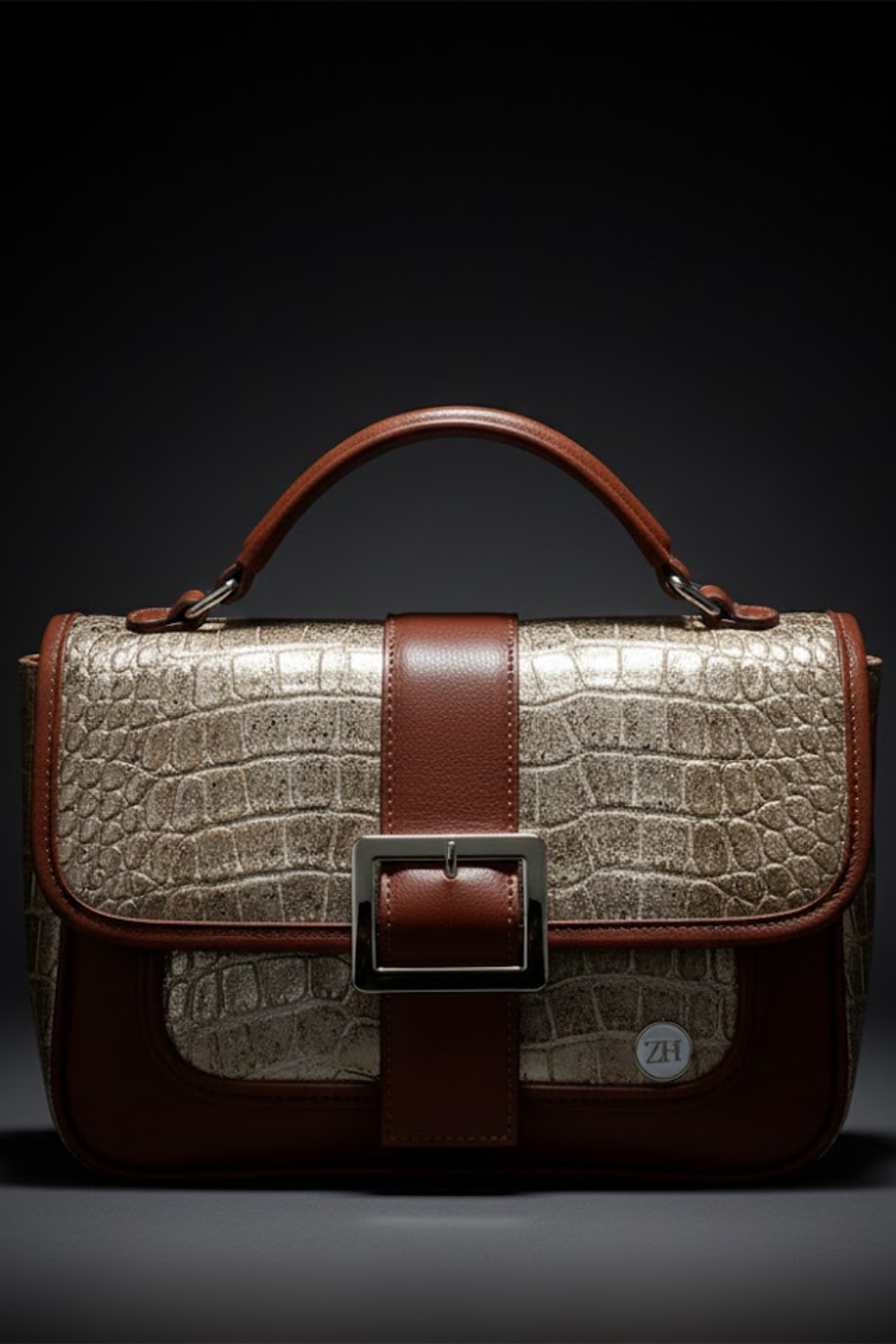 Material: Cuero genuino con textura reptil y detalles metalizados.