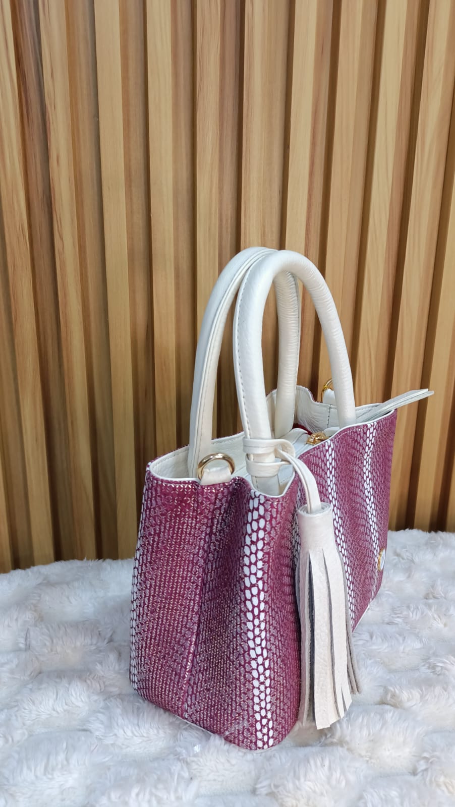 Elegante y versátil, está confeccionado en cuero legítimo colombiano, con diseño estructurado, textura tipo serpiente y un vibrante contraste entre el vino tinto brillante y el blanco marfil. Incluye correa larga removible para usar al hombro o cruzado.