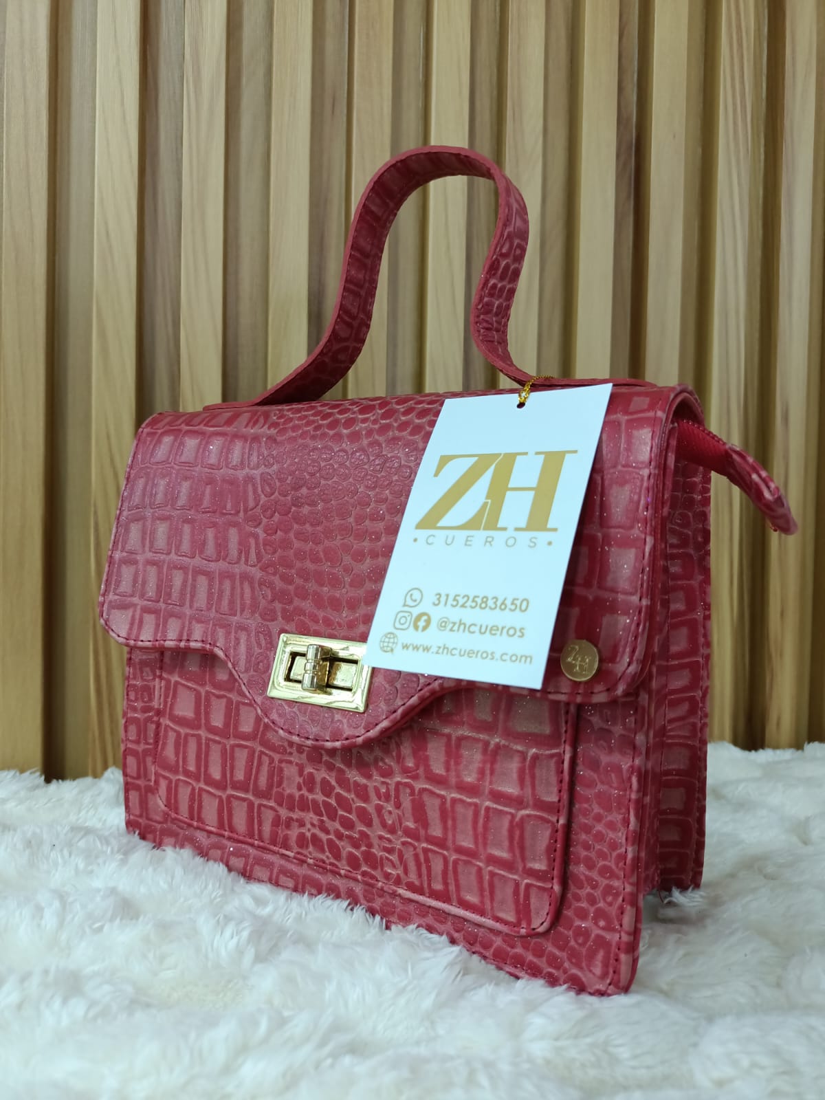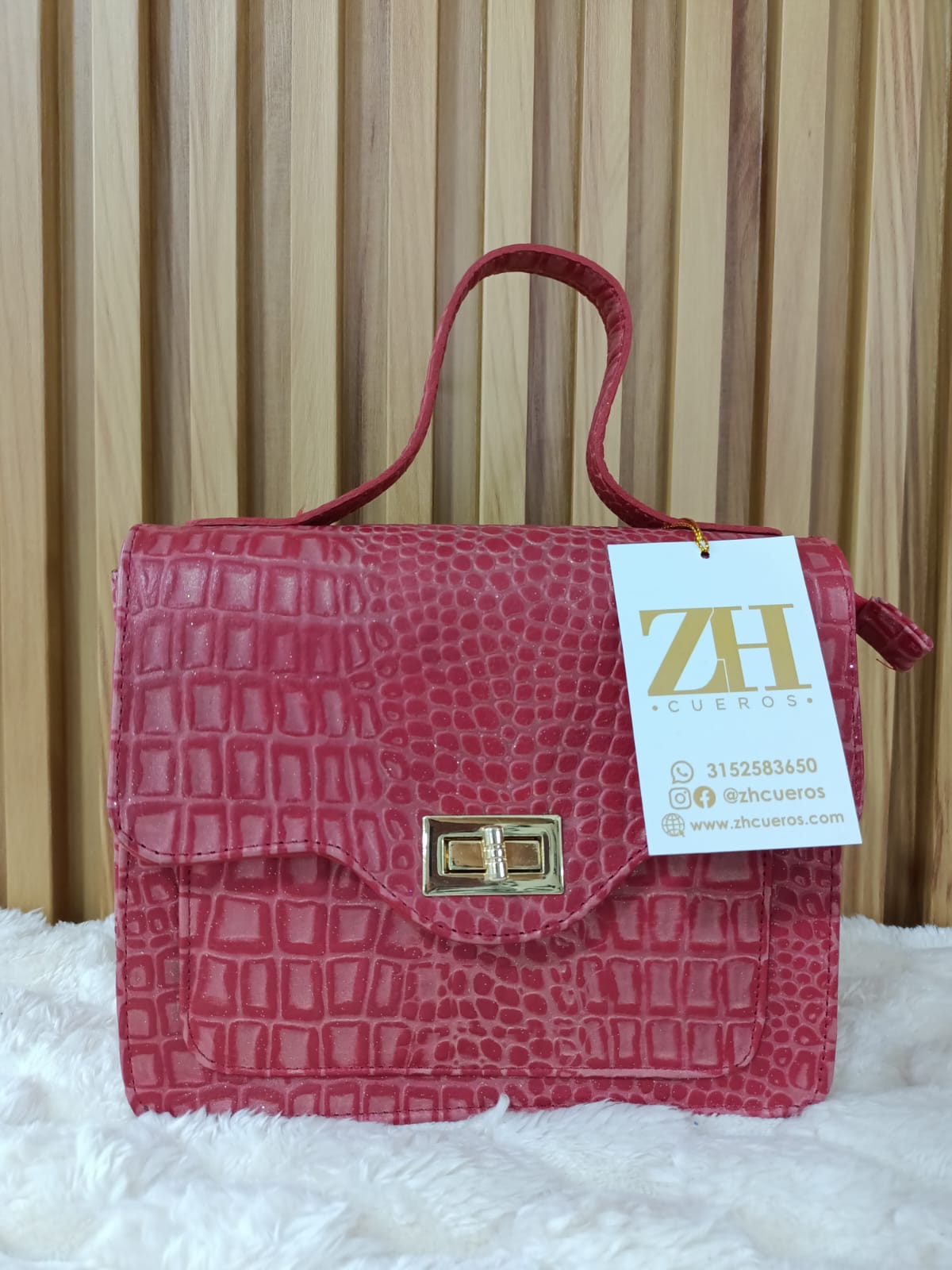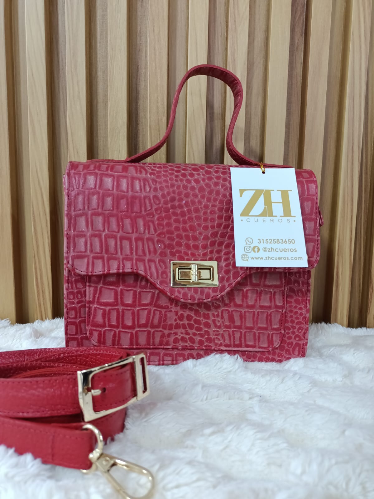 ✔️ Material: Cuero legítimo con acabado texturizado tipo reptil en color berry.