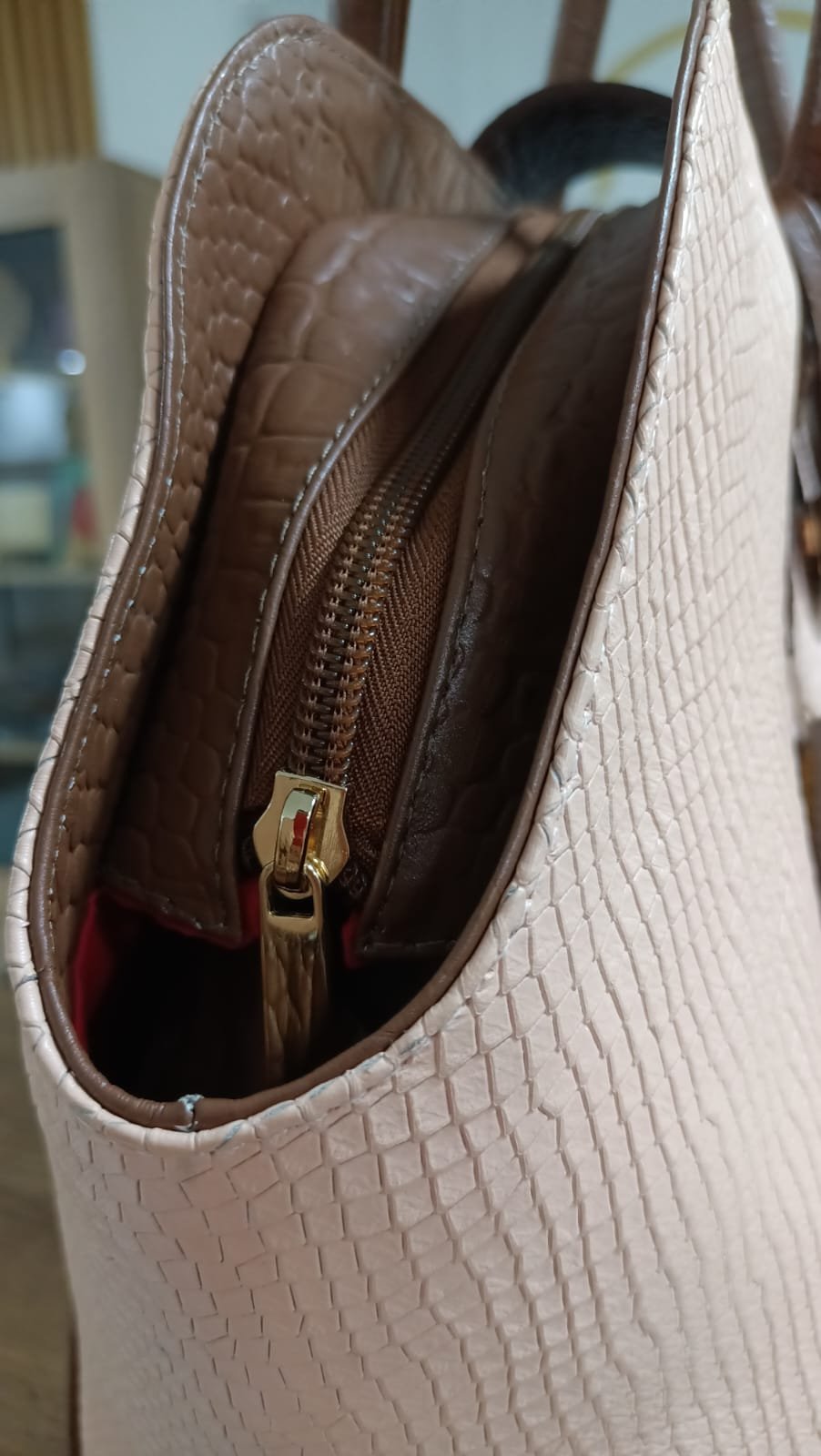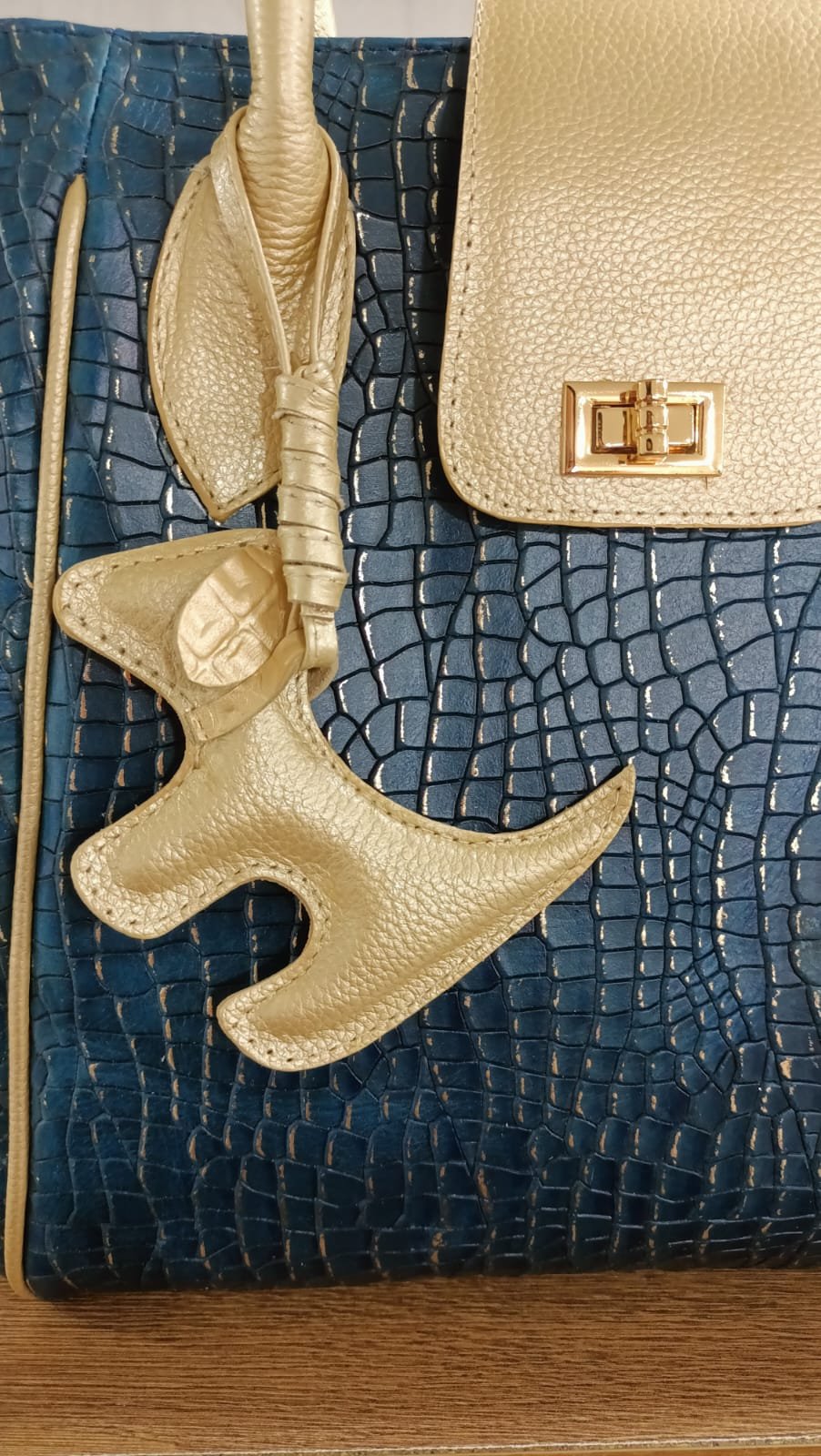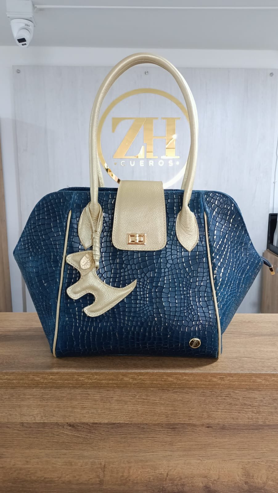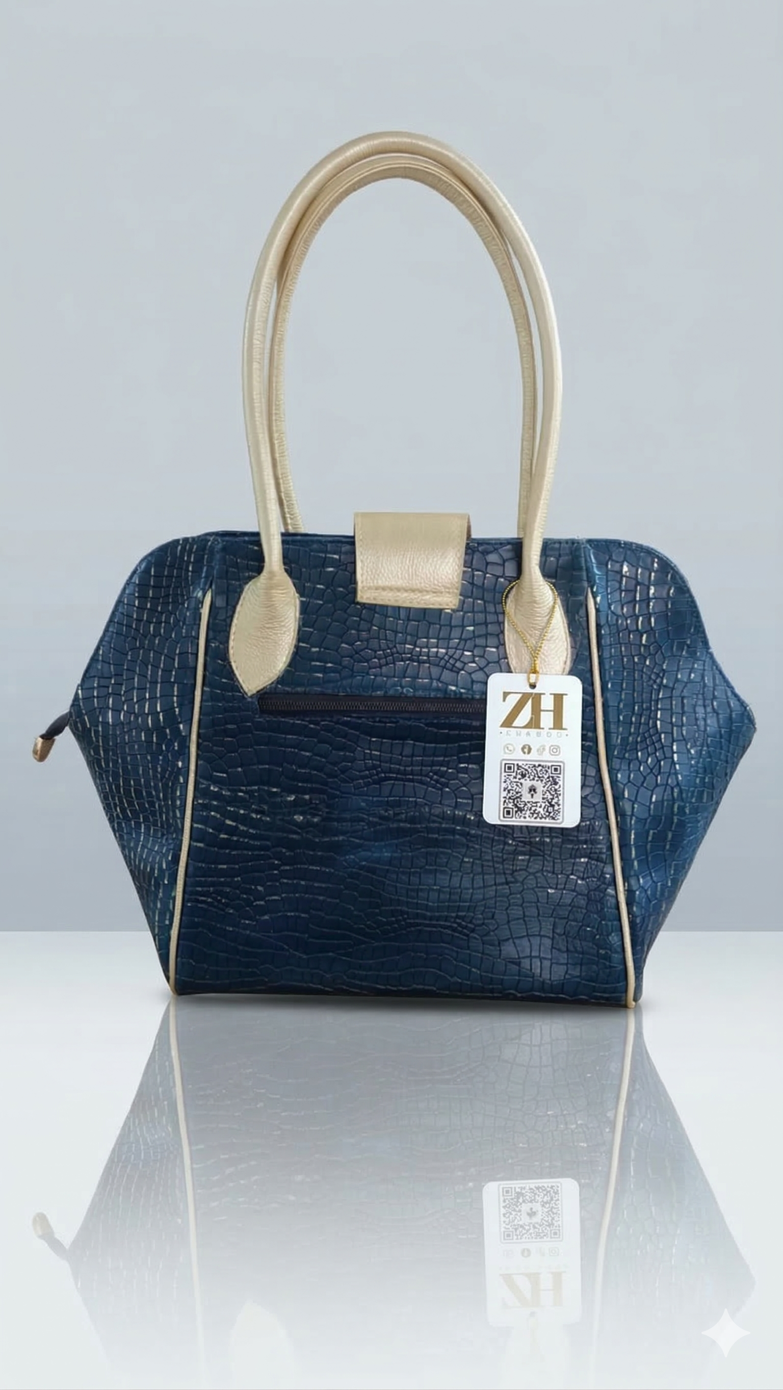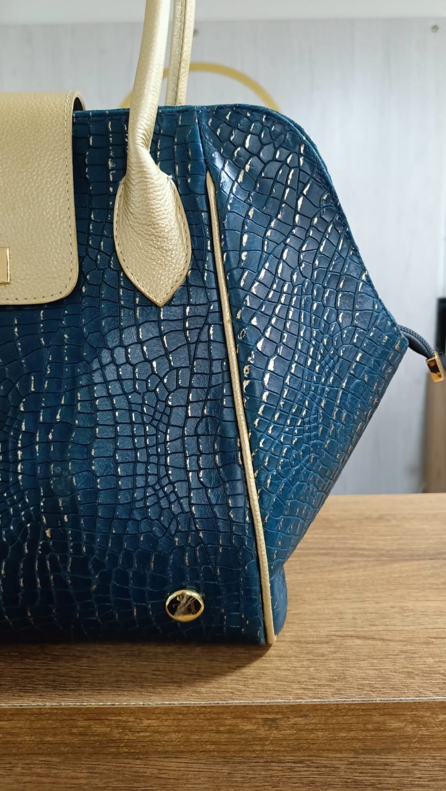 Creado para la mujer que busca un accesorio que proyecte seguridad y una elegancia vibrante, este bolso fusiona la profundidad del azul místico con la luminosidad de los metales preciosos, logrando una pieza de marroquinería de alto impacto visual.