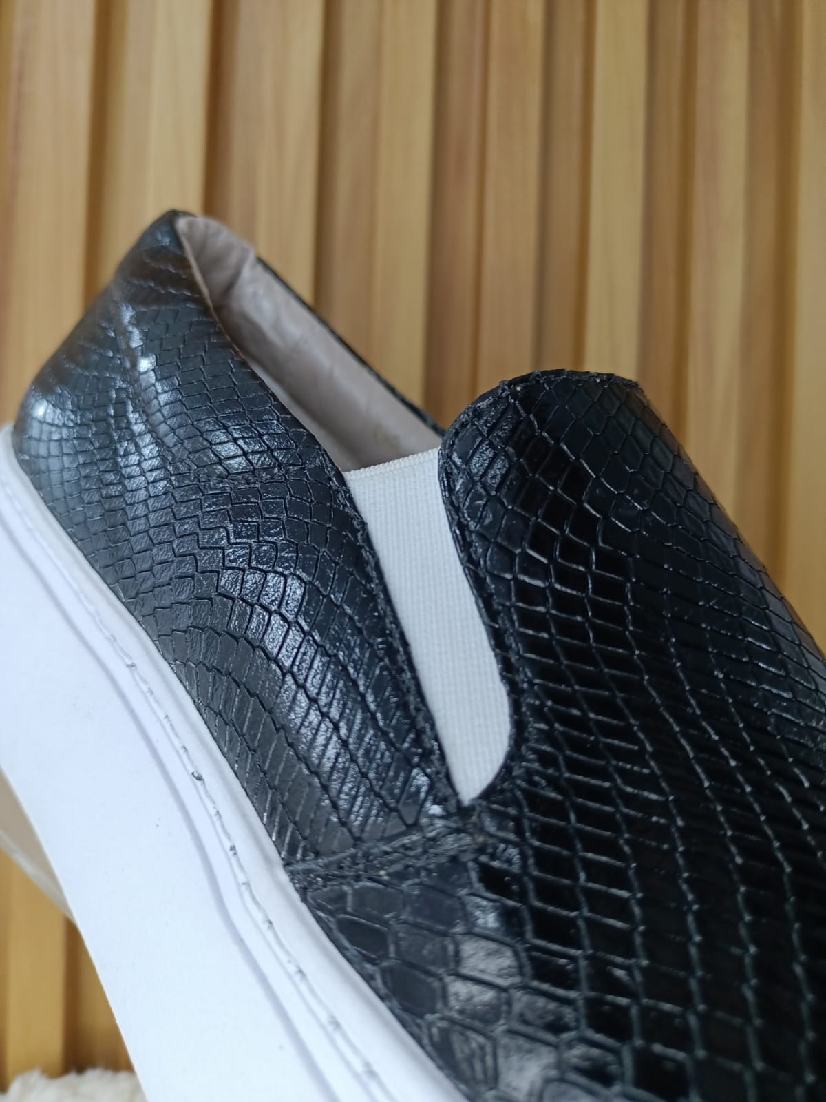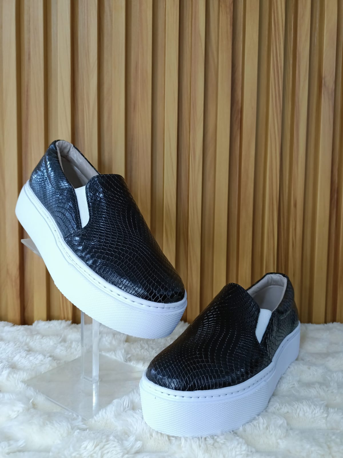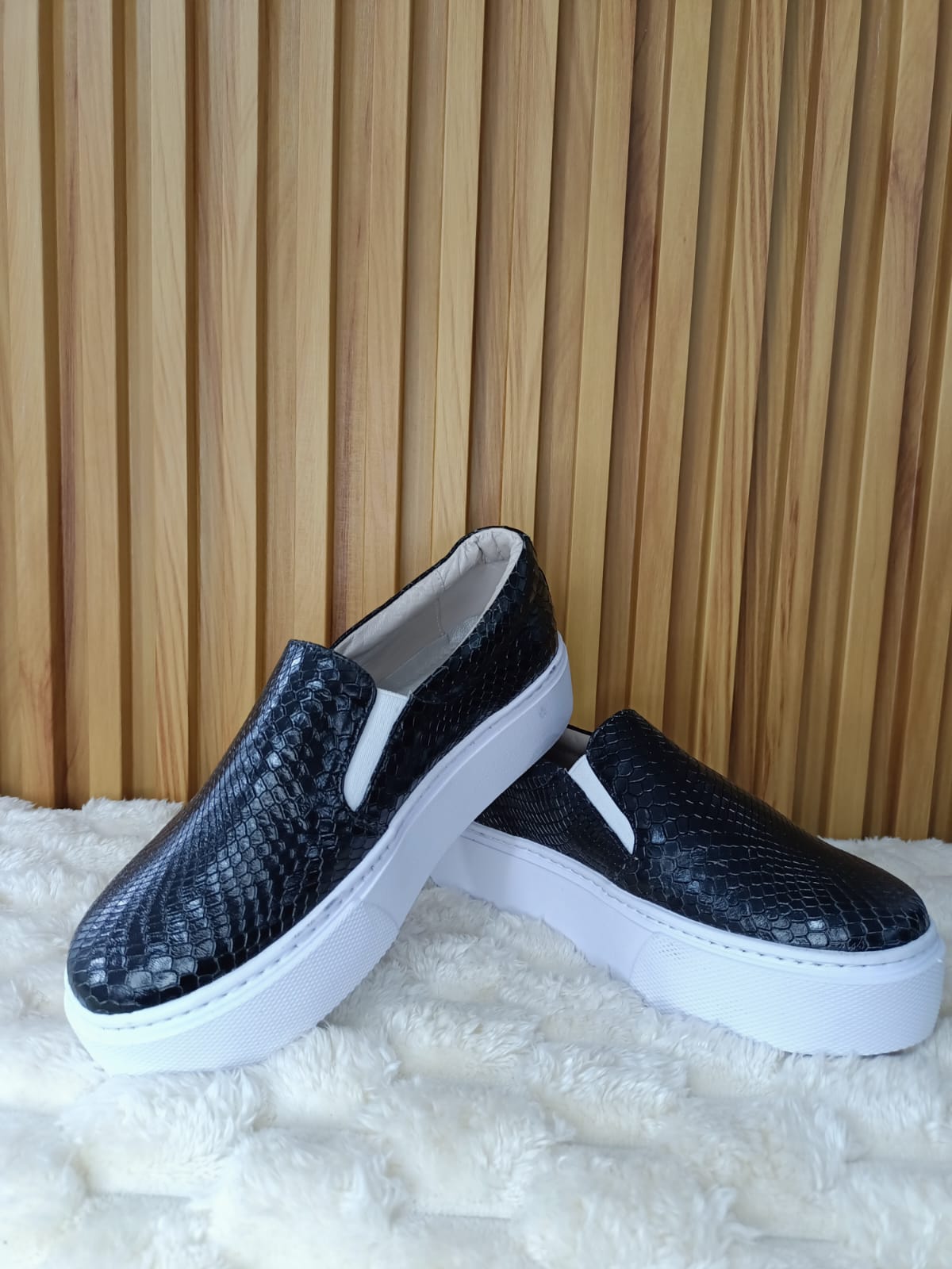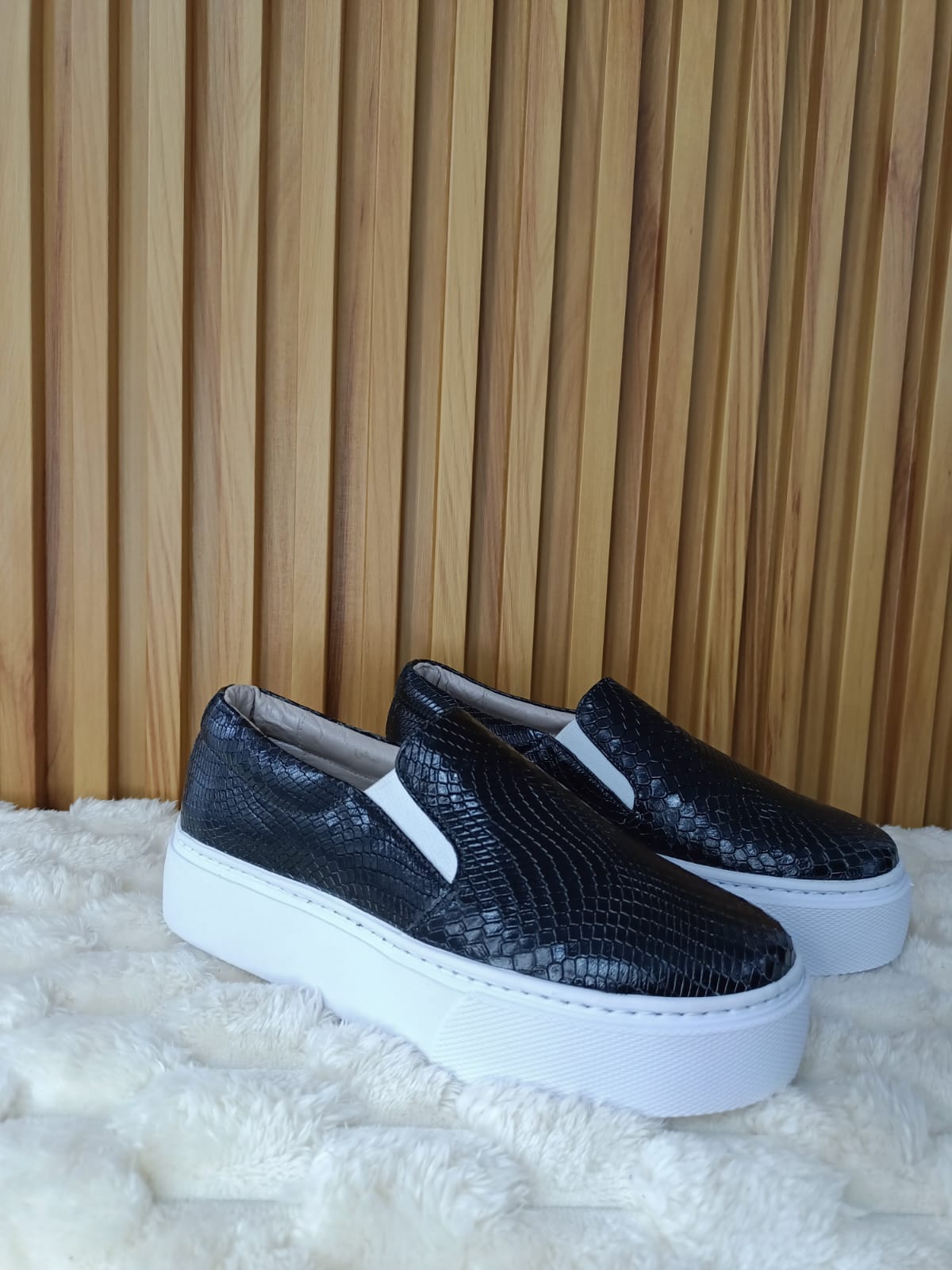 La combinación perfecta entre elegancia y comodidad. Su diseño en cuero legítimo con textura reptil y su suela de plataforma blanca le dan un toque moderno y versátil.