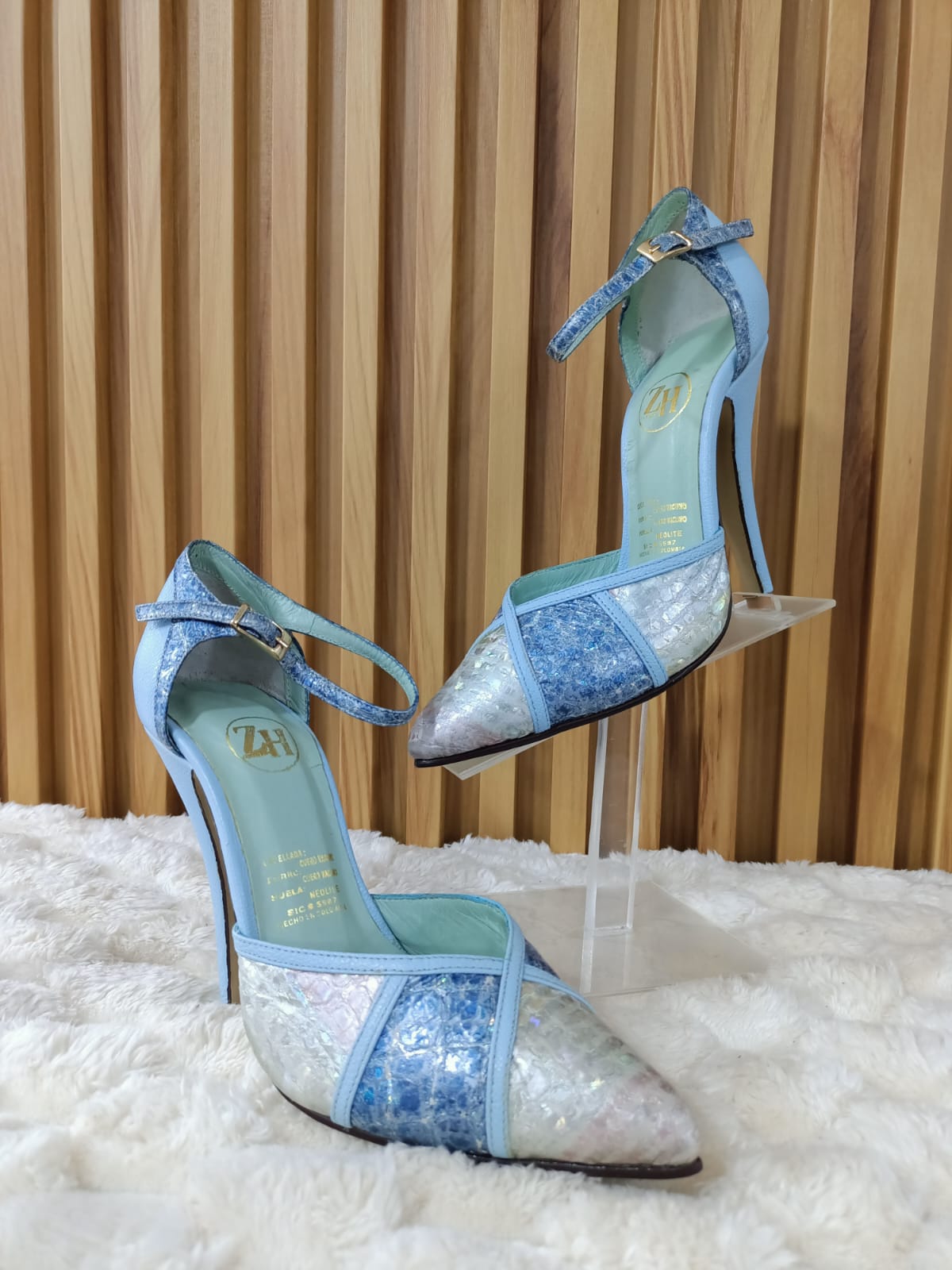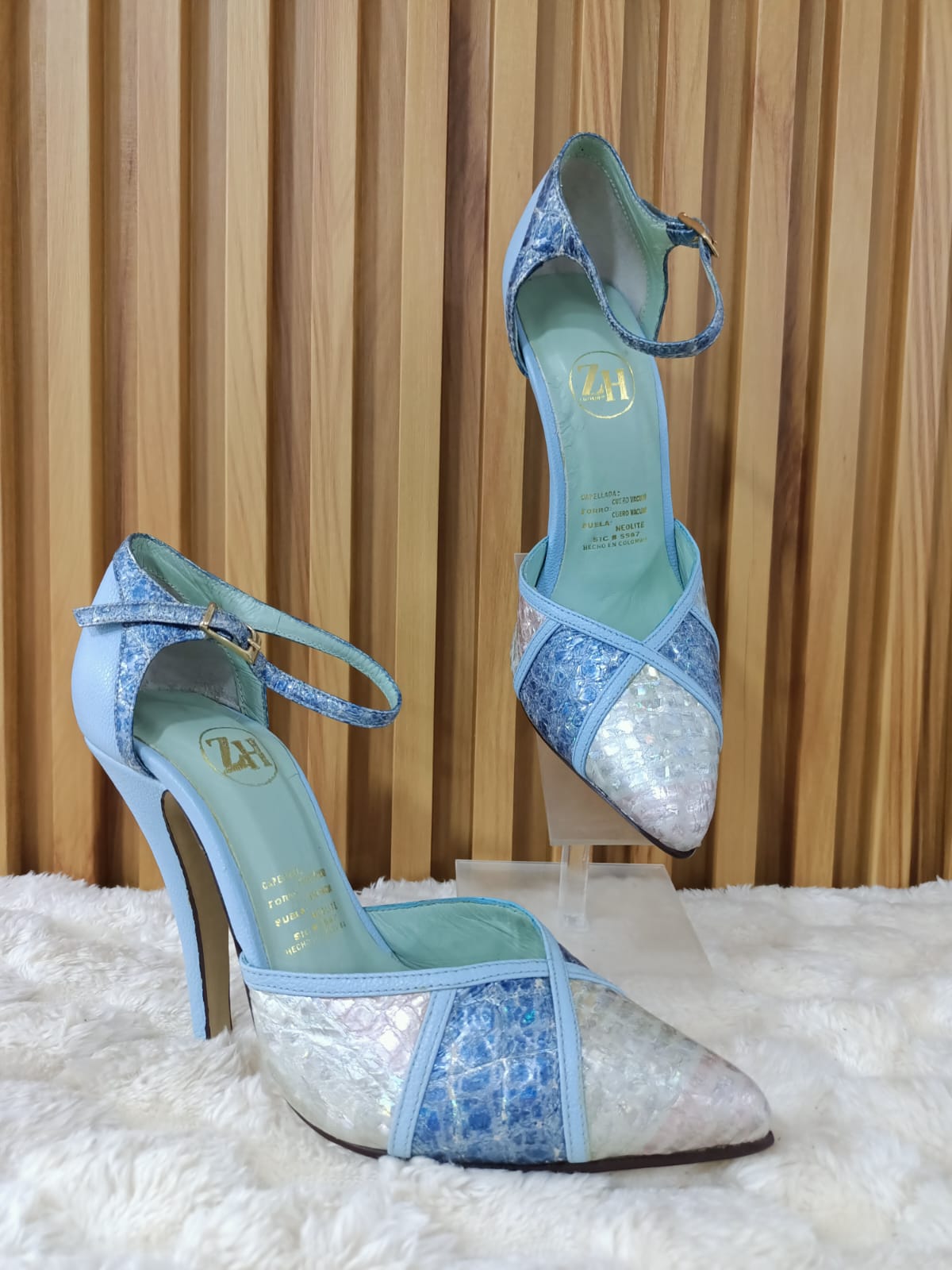 Este elegante stiletto es la combinación perfecta de sofisticación y exclusividad. Diseñado en 100% cuero legítimo, su acabado en tonos azul bebé y detalles en textura reptil aportan un toque de distinción y glamour.