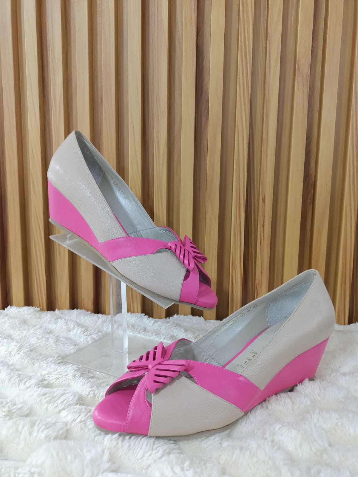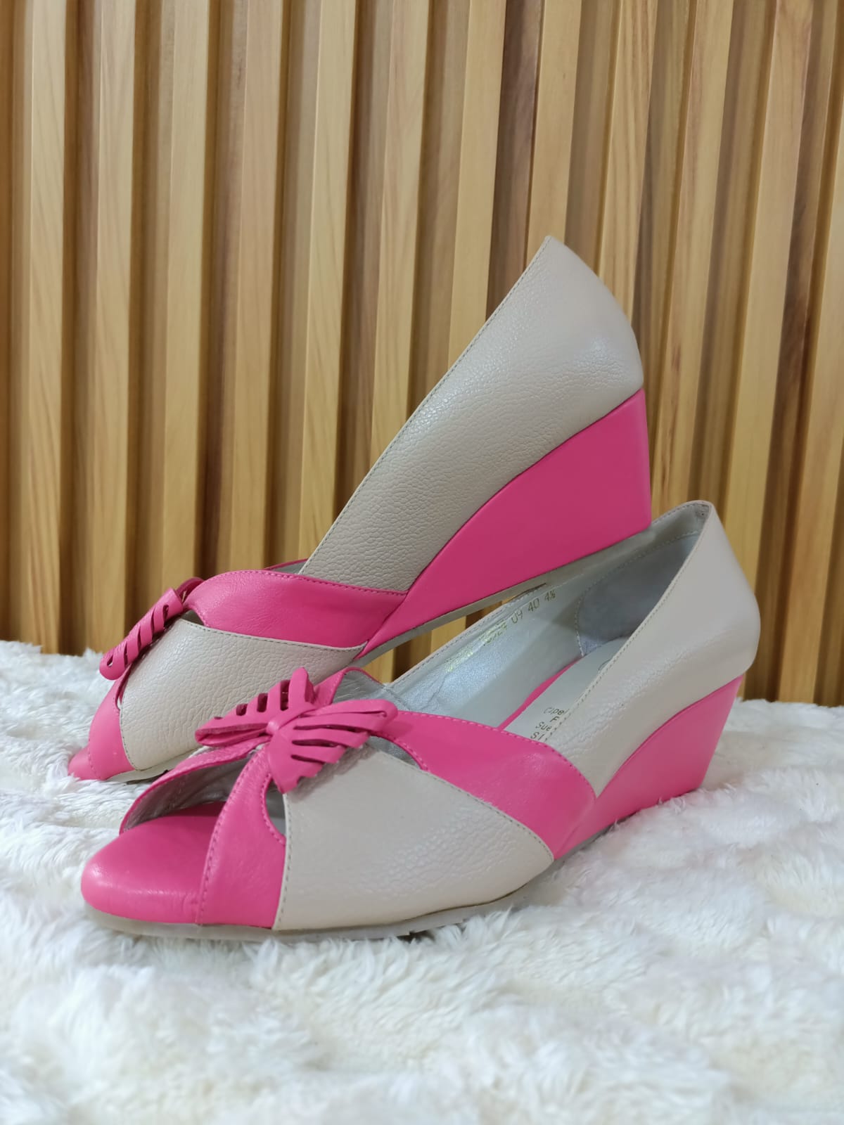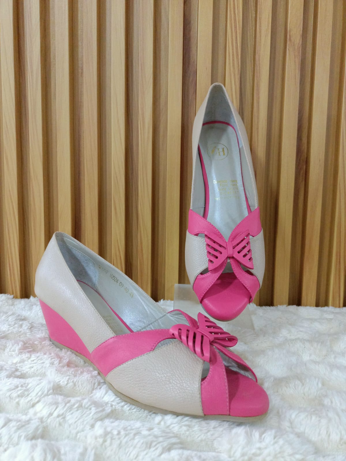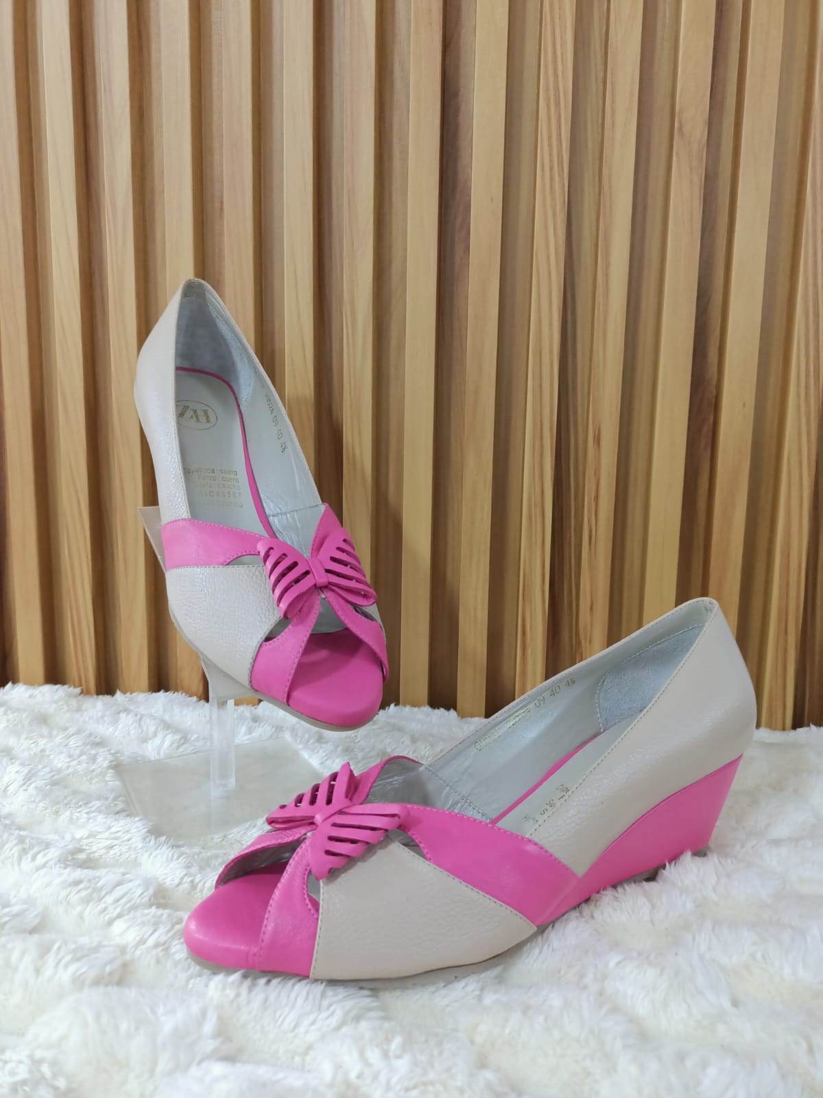 Los Stiletto Mariposa combinan un diseño delicado con la comodidad de un tacón bajo tipo cuña. Su mezcla de tonos beige y fucsia, junto con el detalle de mariposa en el frente, los hace ideales para un look fresco y elegante.