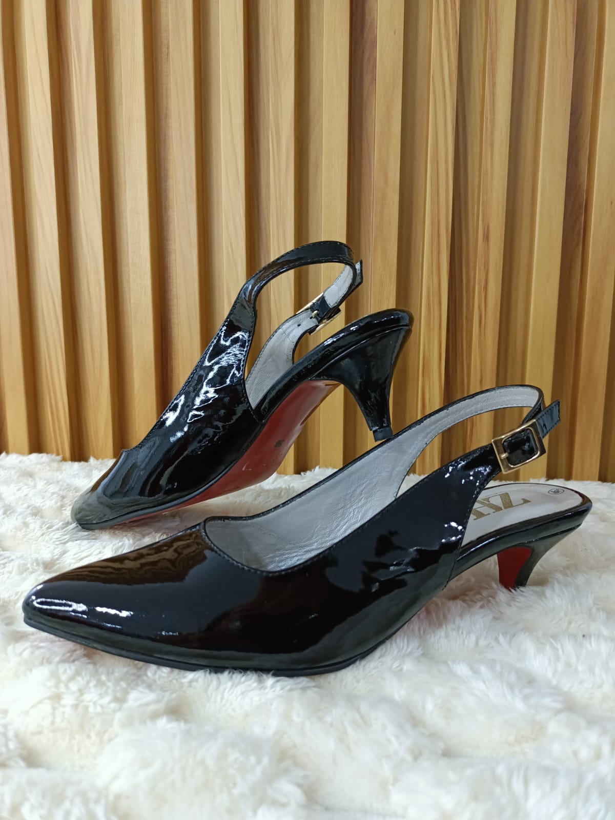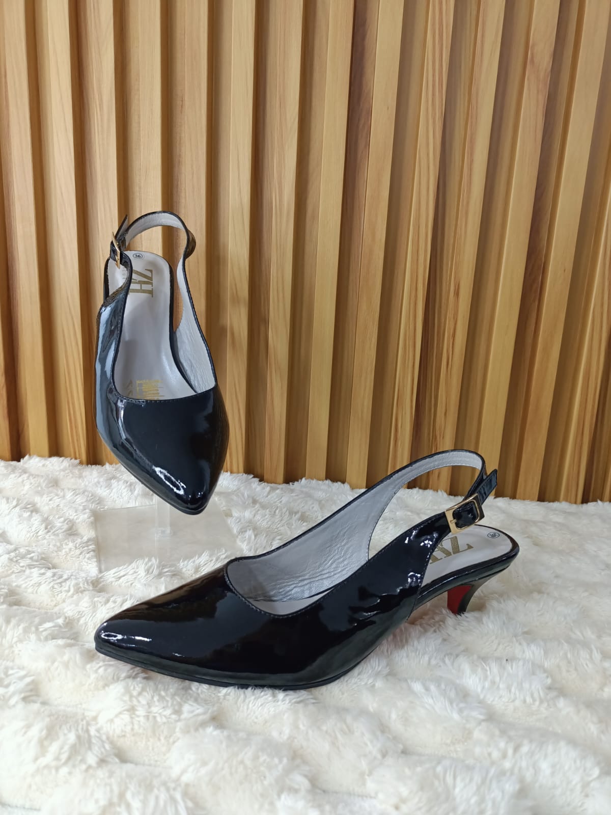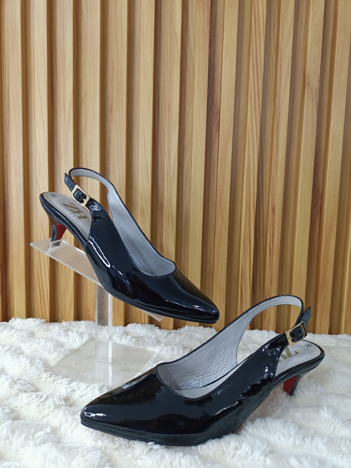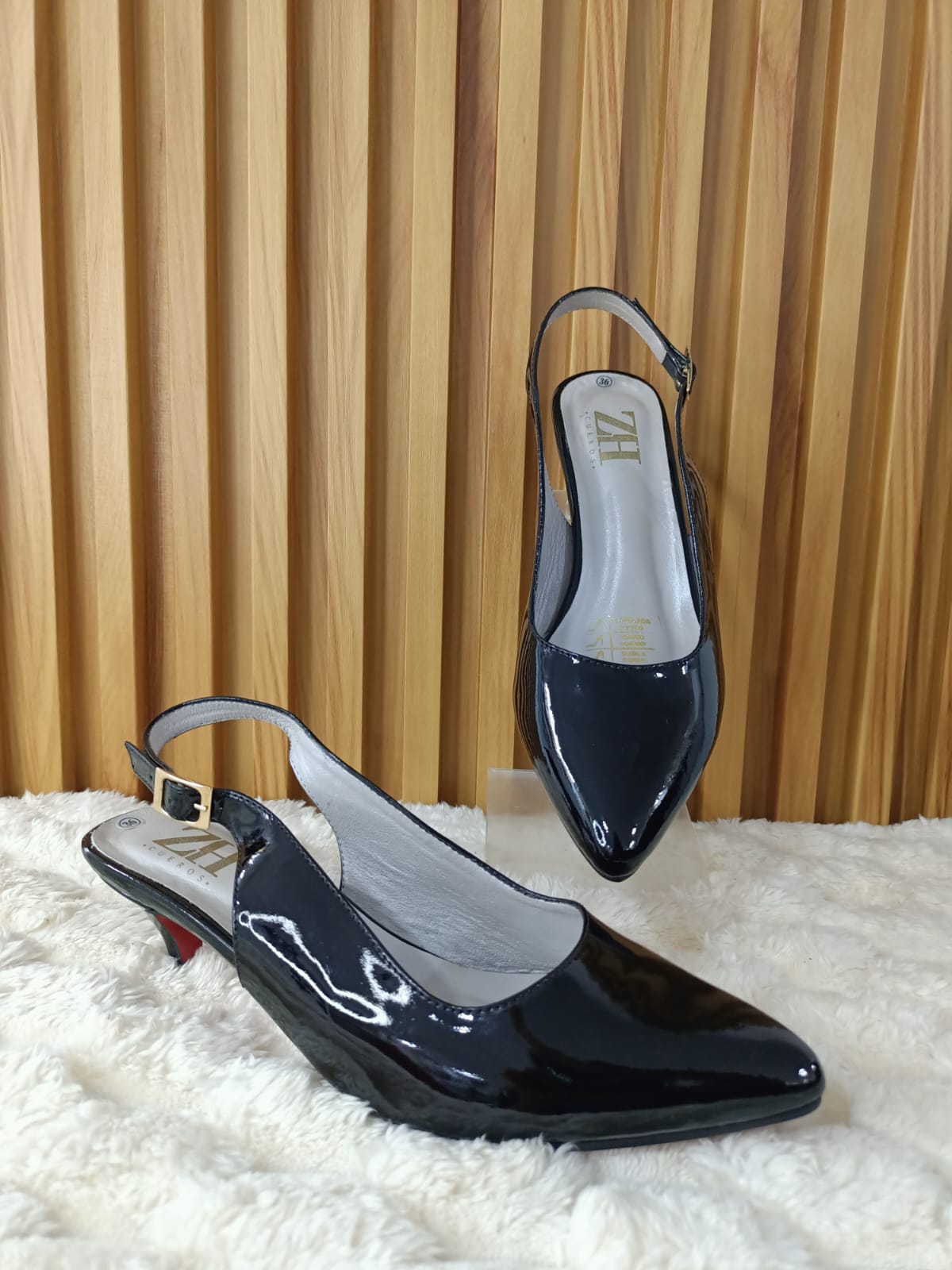 El Stiletto Princesa Negro es la combinación perfecta entre glamour y comodidad. Su acabado en charol negro aporta un brillo sofisticado, mientras que su diseño slingback con tacón bajo lo hace ideal para cualquier ocasión.