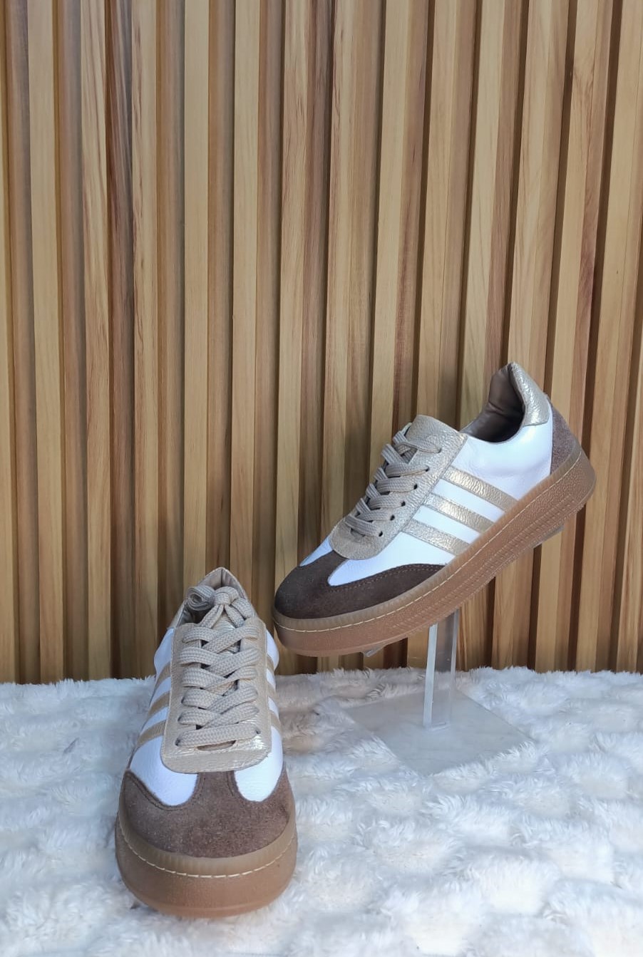 Diseñados para mujeres con estilo y actitud, los tenis Amber combinan cuero genuino en tonos tierra con acabados metalizados dorados que iluminan tu caminar. Su diseño con franjas laterales aporta un aire deportivo sofisticado, ideal tanto para looks casuales como para atuendos más urbanos.