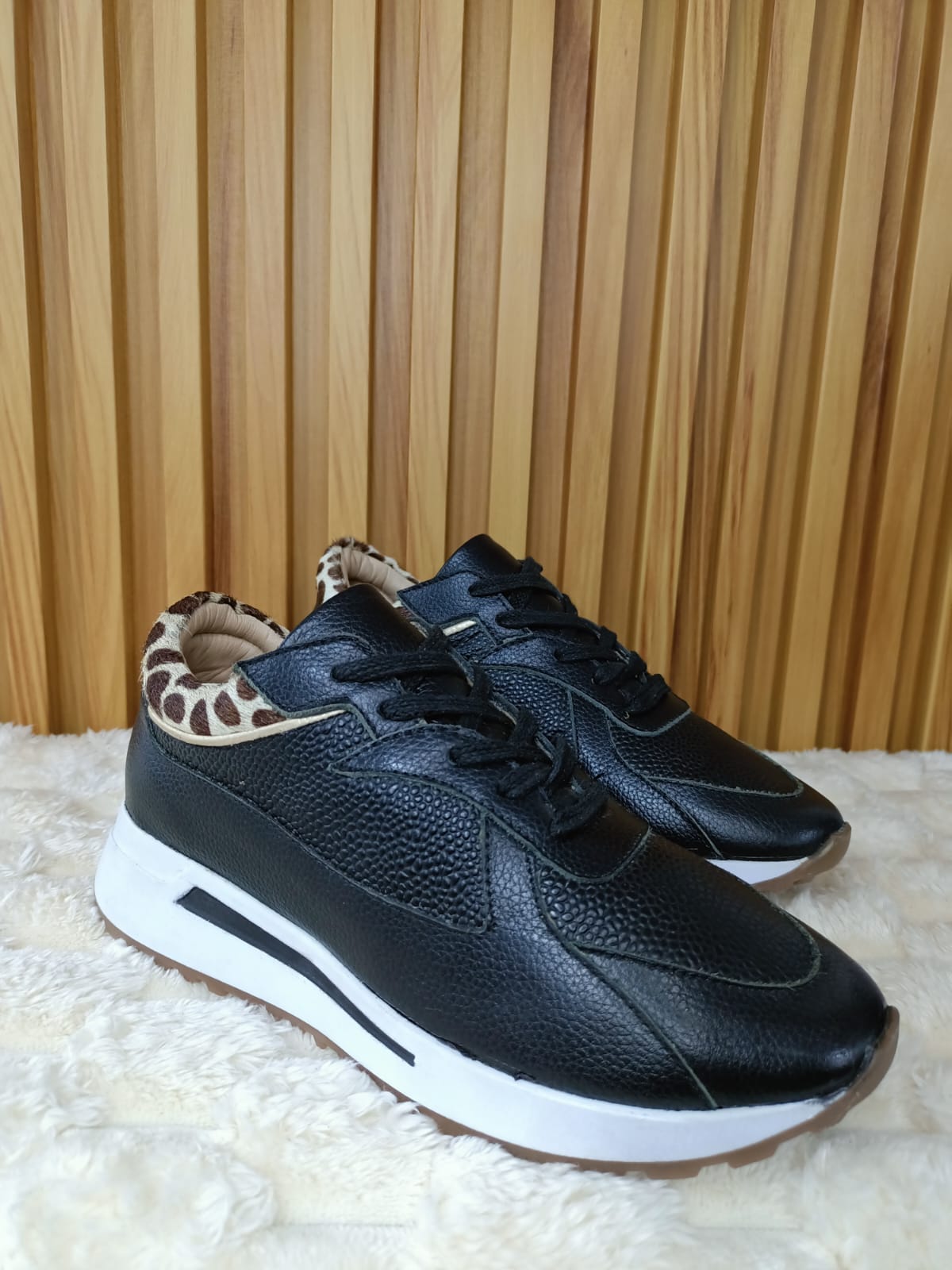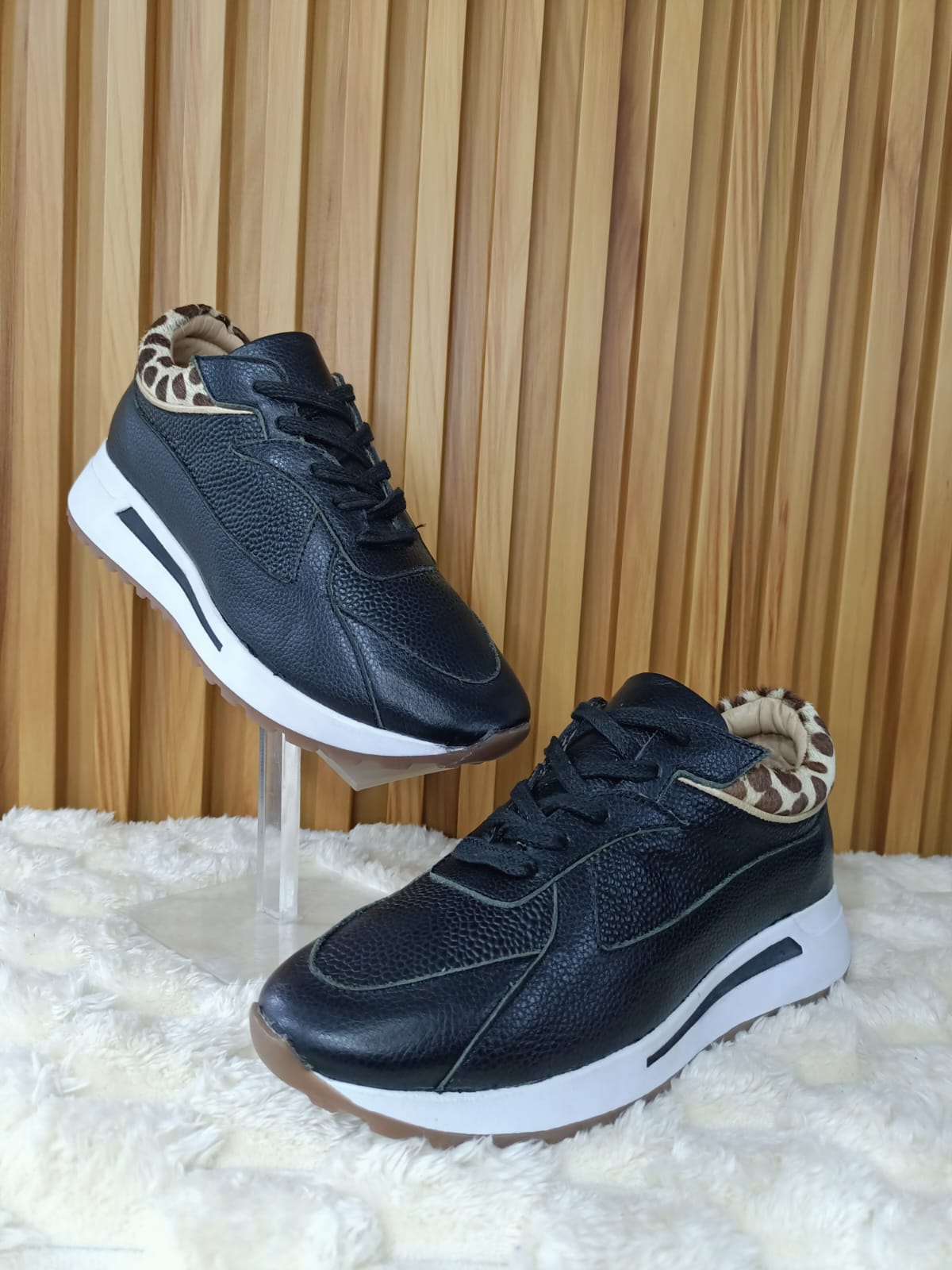 Dale un toque salvaje y sofisticado a tu outfit con estos exclusivos tenis de cuero. Su combinación de negro elegante y detalles en animal print los convierte en el complemento perfecto para quienes buscan estilo y comodidad.