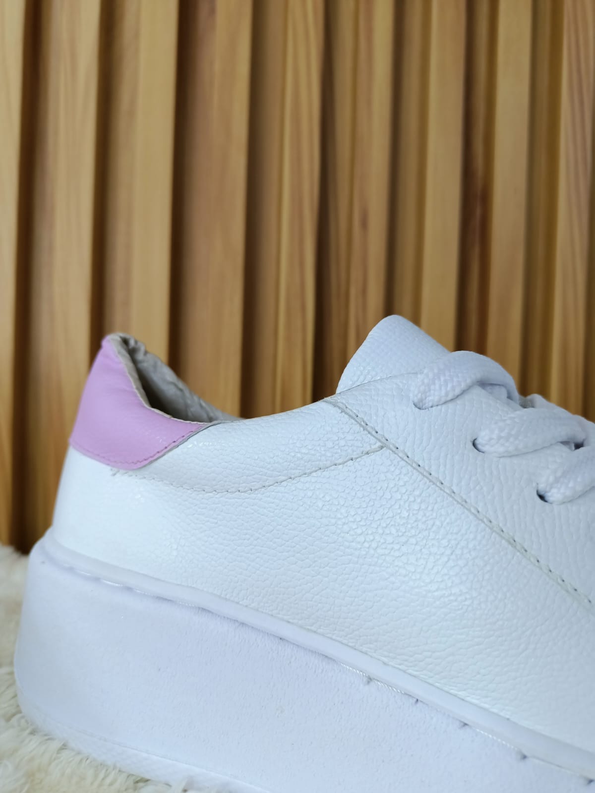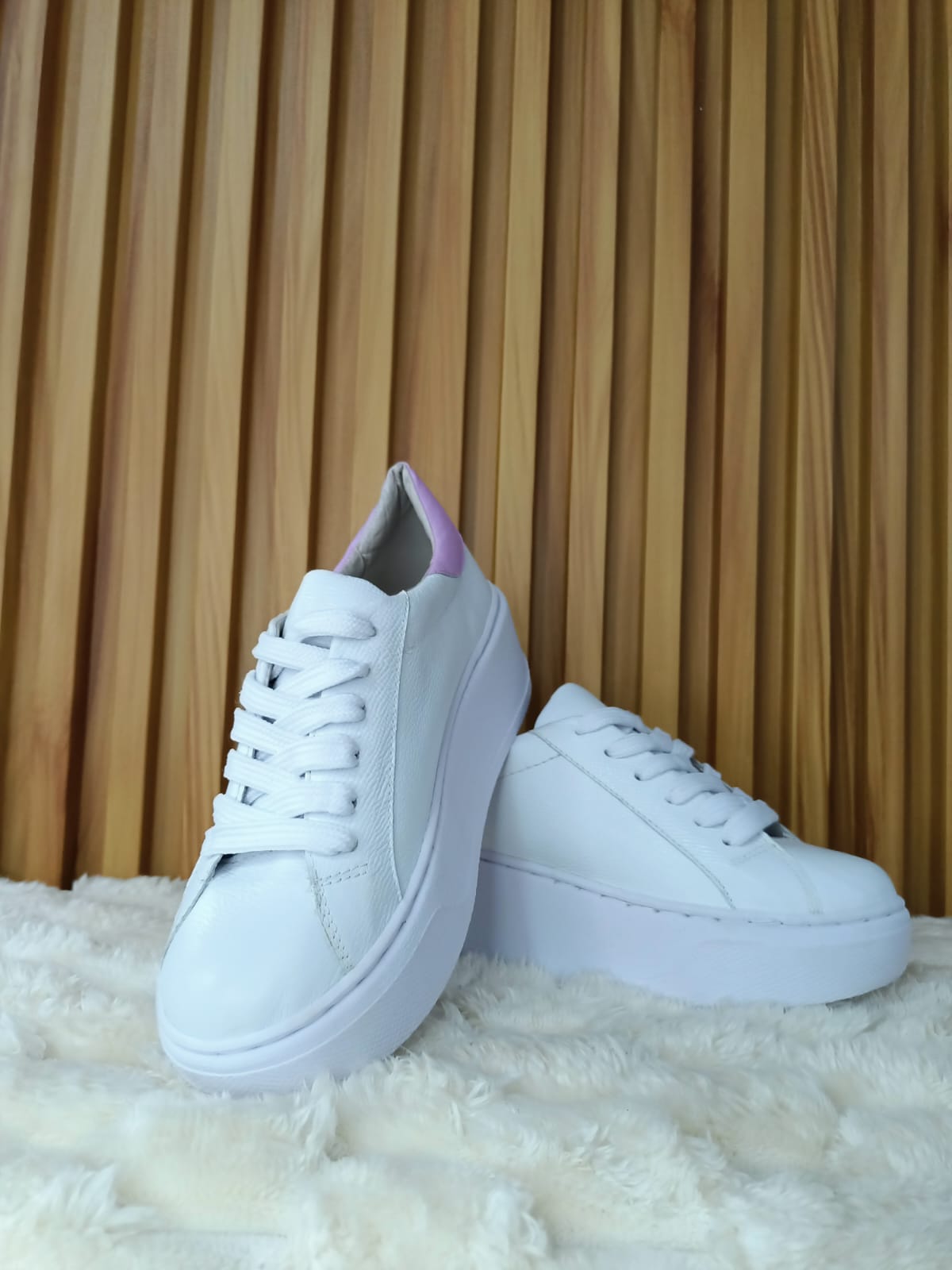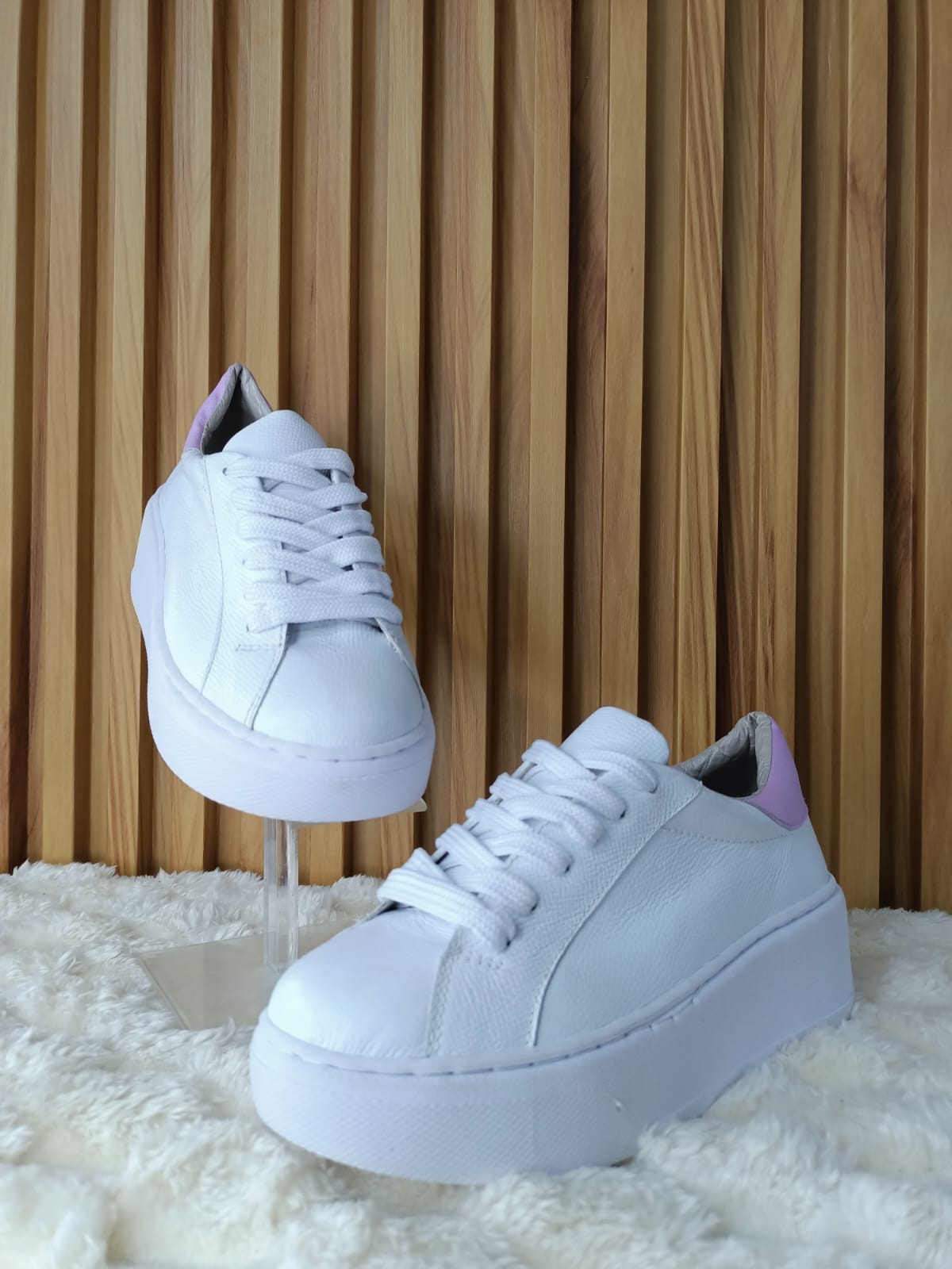 La combinación perfecta de elegancia y comodidad en un diseño moderno y versátil. Estos tenis de cuero en blanco puro con detalles en lila suave te darán el toque femenino y sofisticado que buscas.