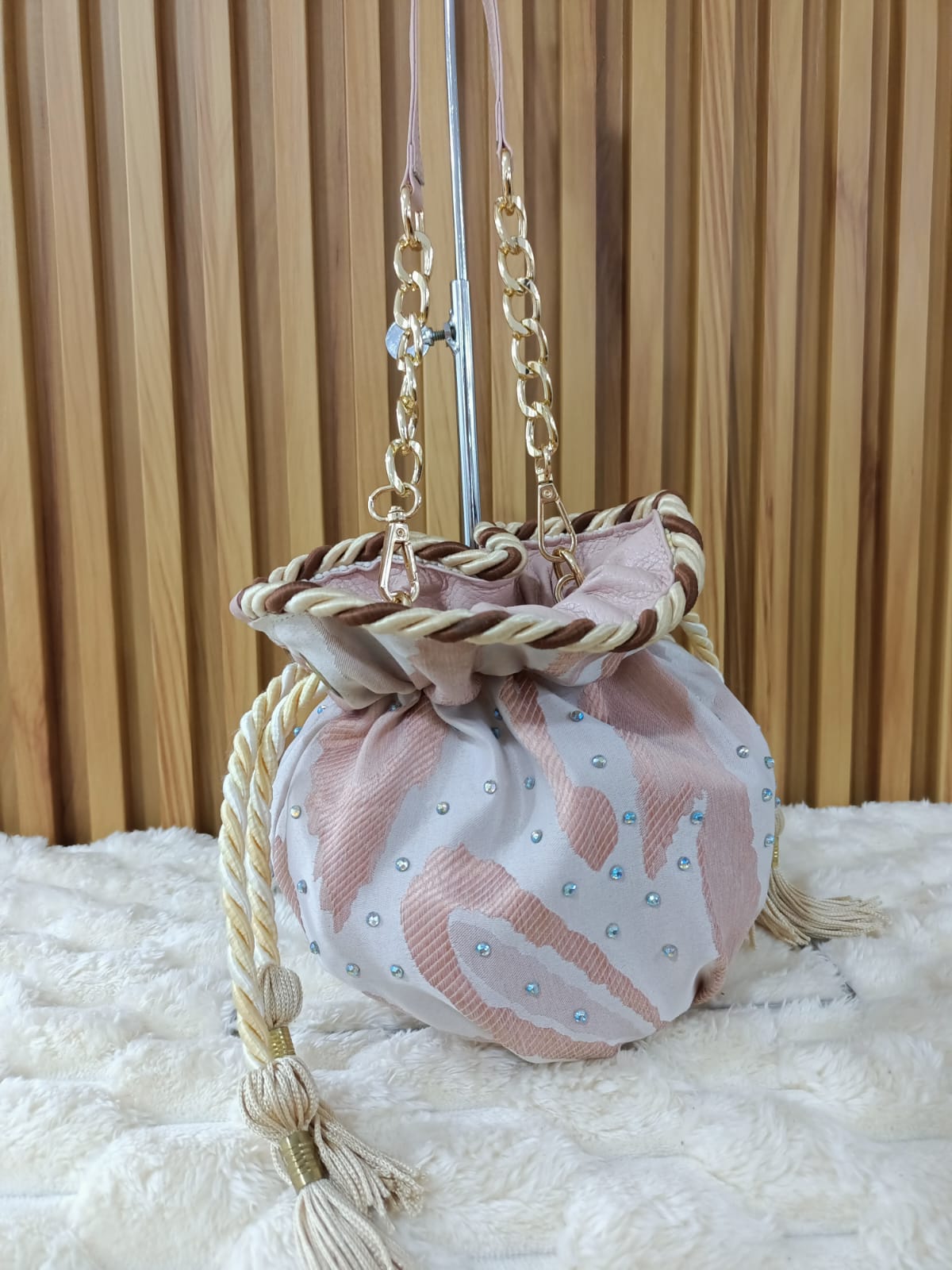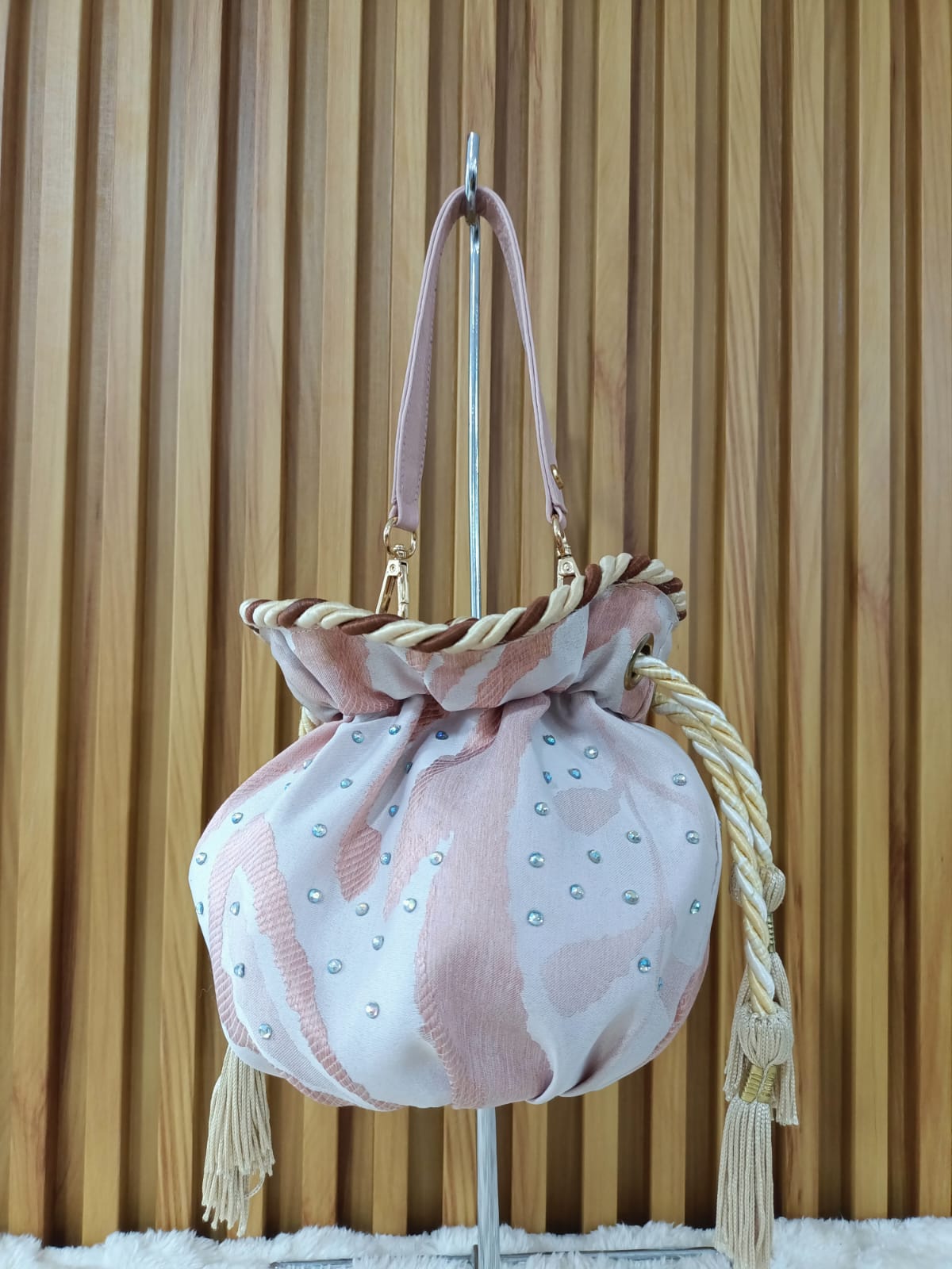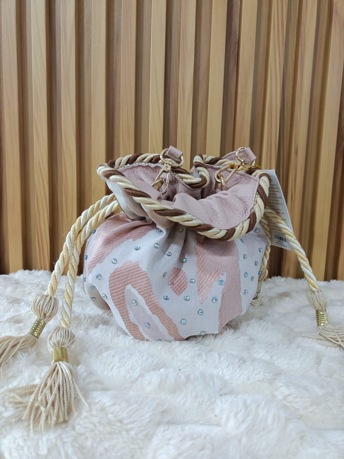 Un diseño elegante y sofisticado que combina la suavidad de la tela con la resistencia del cuero. Detalles únicos con brillos y cordón decorativo que la hacen perfecta para cualquier ocasión.