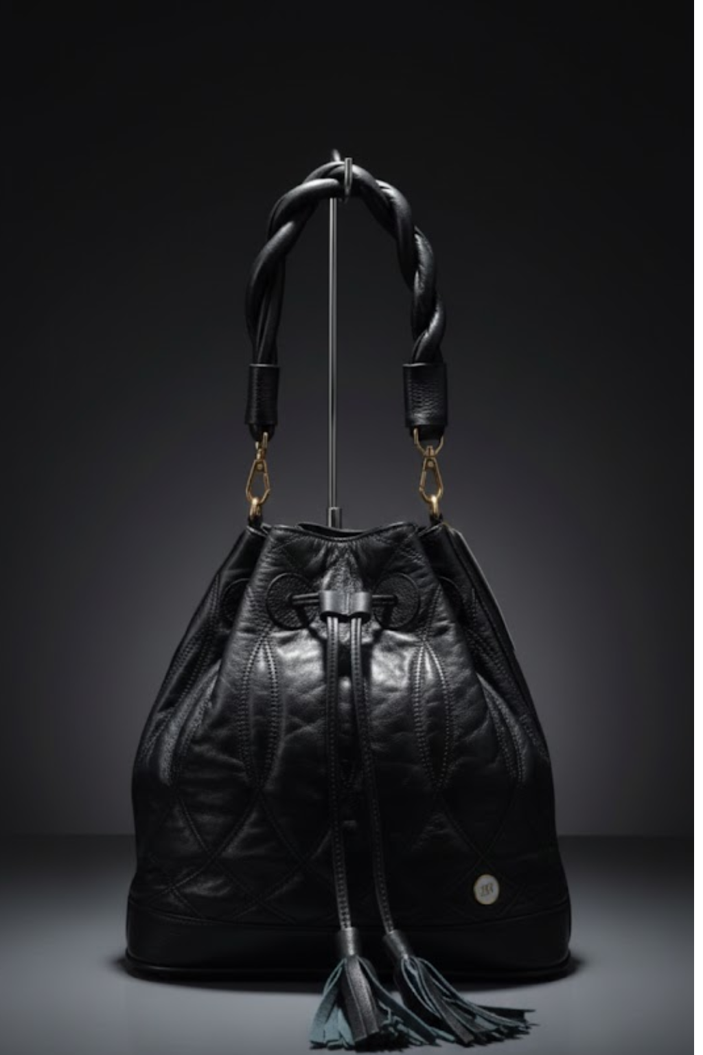 Cierre tipo frunce con cordón de cuero y borlas decorativas.